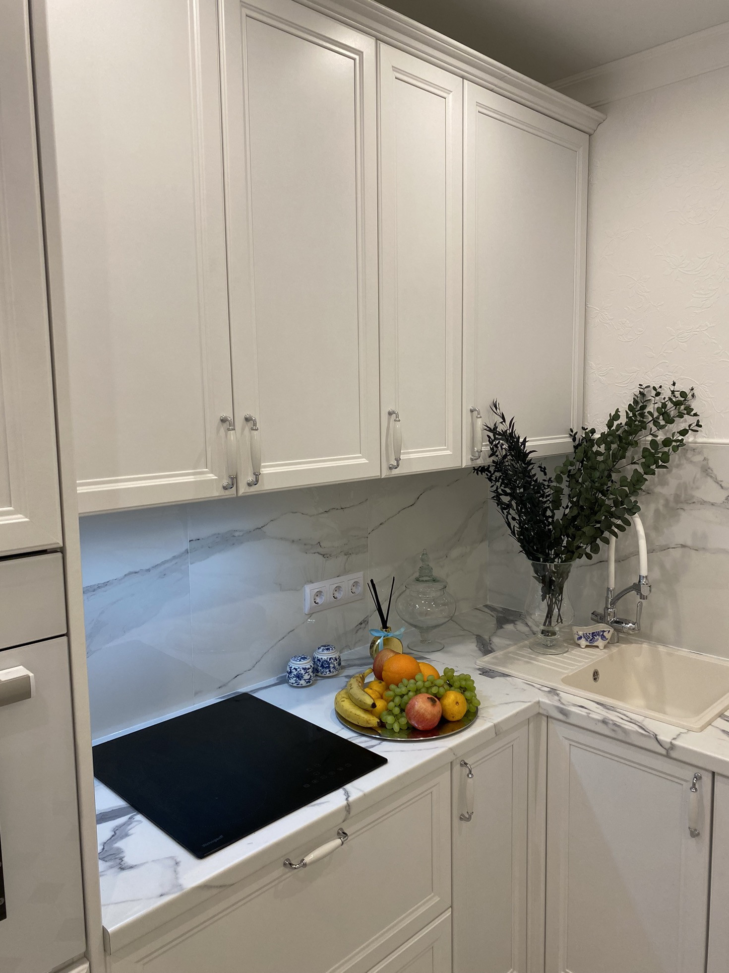 • кухонный гарнитур полностью укомплектован бытовой техникой: встроенный двухкамерный холодильник, индукционная варочная панель , духовой шкаф, мощная вытяжка, посудомоечная машина