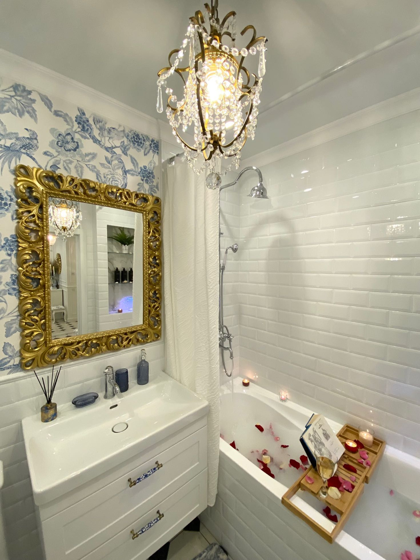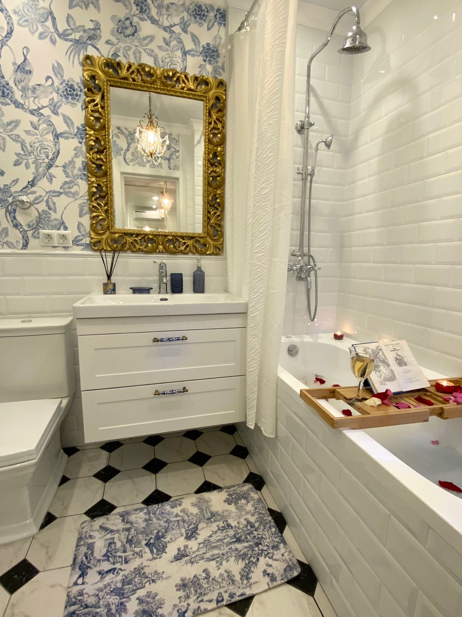 Ну, и вишенка на торте- элегантная ванная комната с душевой системой ( в ретро стиле), гигиеническим душем, большой тумбой и раковиной, вместительным навесным шкафом, проточным водонагревателем и комфортной ванной.
