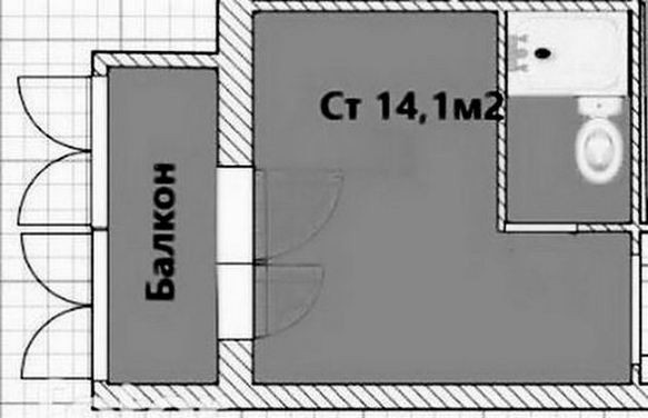 Студия общей площадью 14 м2 с лоджией 3.6 м., под ремонт.