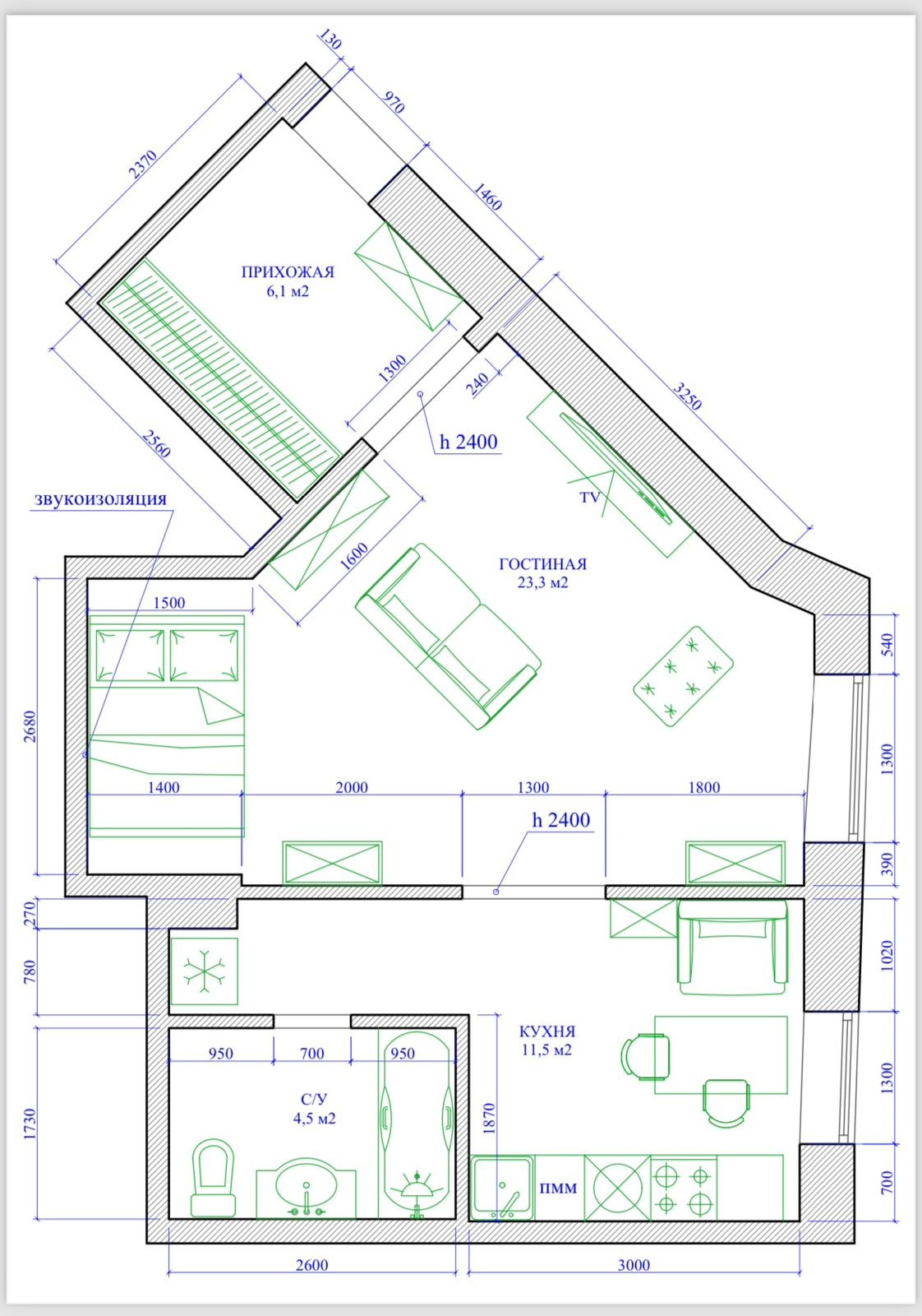 Удобная планировка: квадратный коридор 6 кв.метров с шкафом 2,5 метра, гостиная 22 метра с нишей-спальней, кухня 9 метров с дополнительным спальным местом - кресло-кровать, санузел совмещен 4,5 метров кв, ванна - искусственный мрамор.