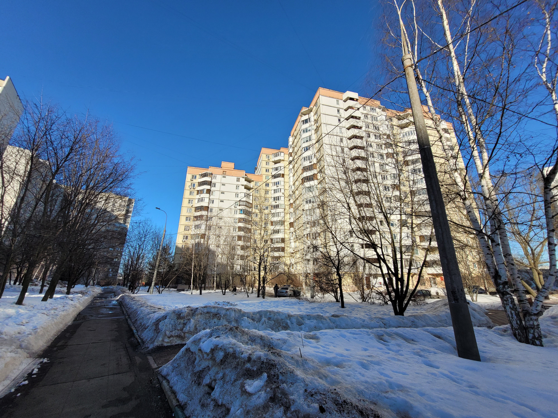 Отлично развита социальная инфраструктура. Почти в каждом дворе есть школа и детский садик. Несколько крупных торговых центров, различные магазины, спортивные учреждения, бассейн, поликлиники, ландшафтный парк "Митино" и Митинский лесопарк.