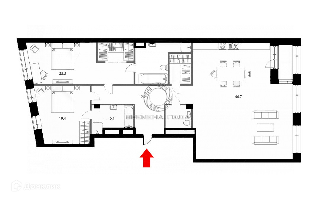 Возможный вариант планировки: кухня с обеденной зоной и гостиной, две изолированные комнаты, два санузла, гардеробные.