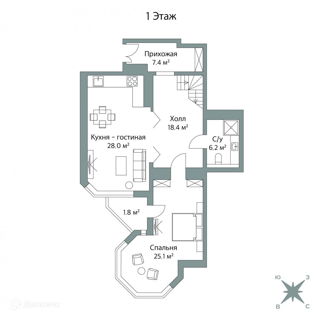 Просторная кухня-гостиная - 28 кв. м.; спальня/кабинет с эркером - 25,1 кв. м.; зона прихожей и холла - 25,8 кв. м.; санузел - 6,2 кв. м.