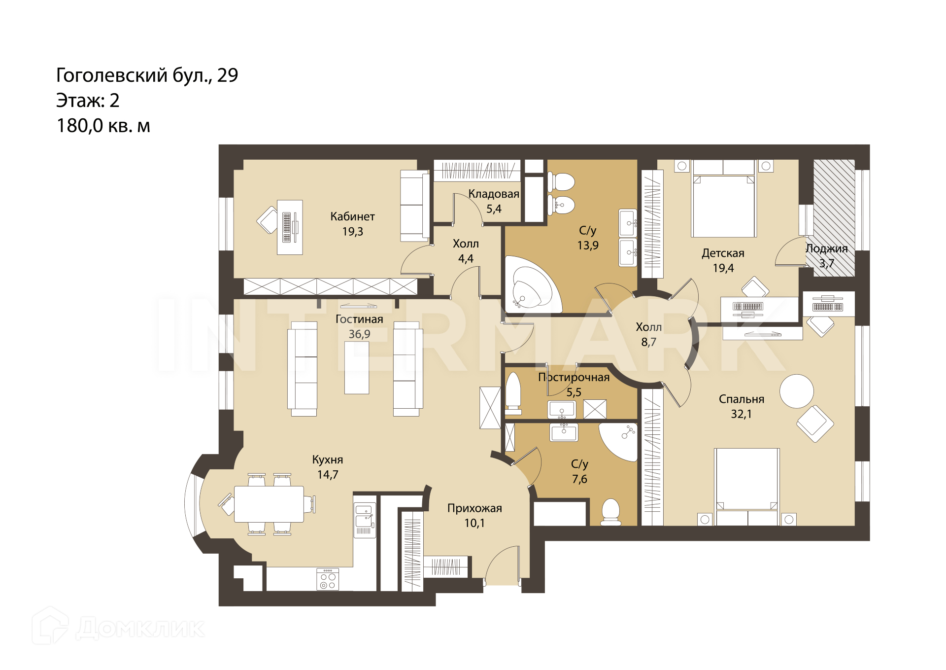 4-комнатная квартира, 180 м2, этаж 2 / 8, на продажу в Москве, Гоголевский бульвар, 29