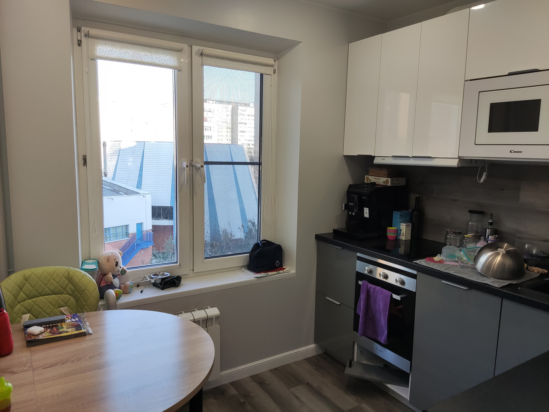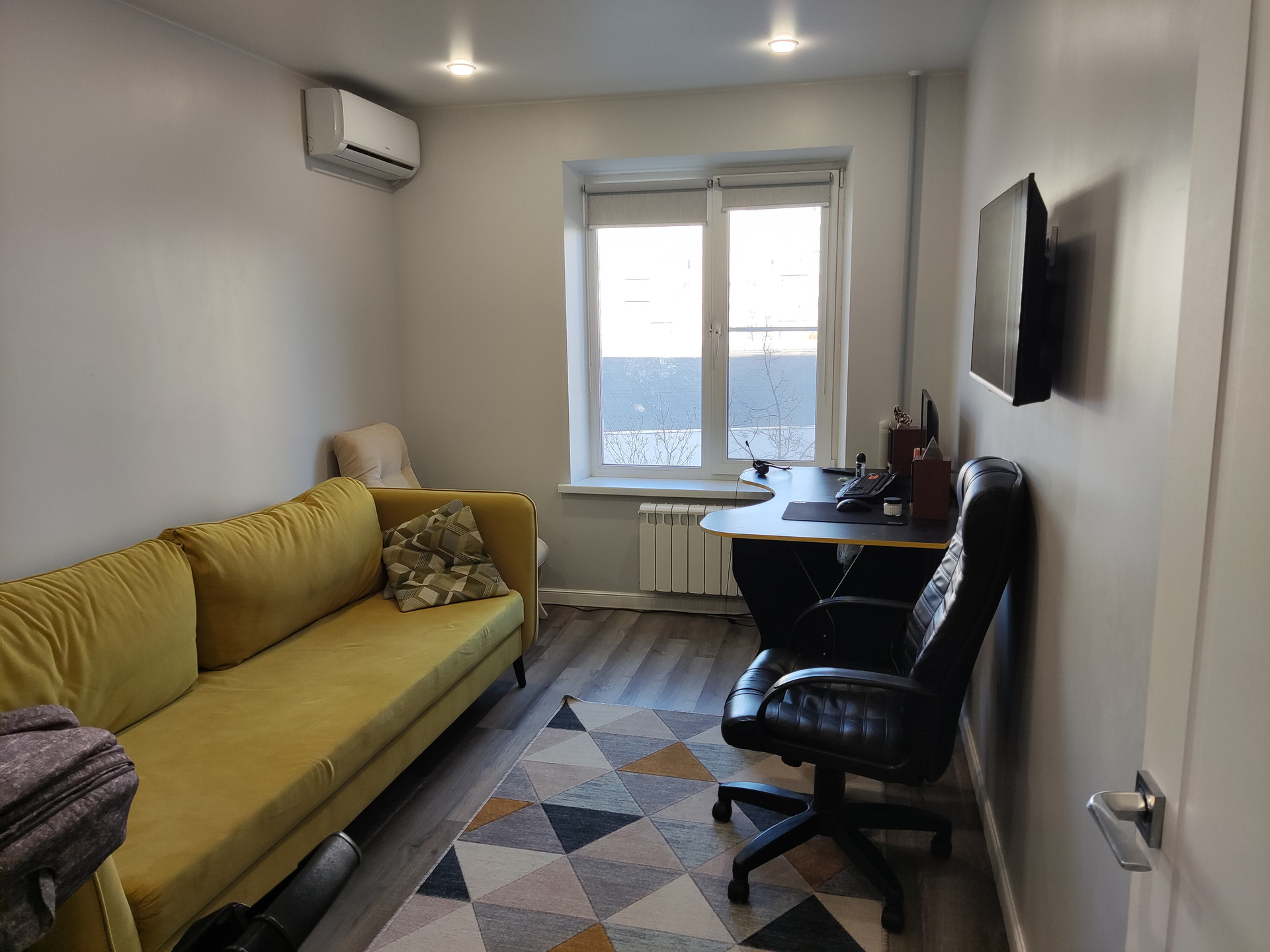 В квартире произведён качественный(ЕВРО) ремонт. Делали под себя.  Полы ламинат, потолки натяжные, окна ПВХ, установлены новые батареи, балкон застеклен, кондиционеры, стены под покраску. После продажи, в квартире остаётся вся мебель и бытовая техника.
