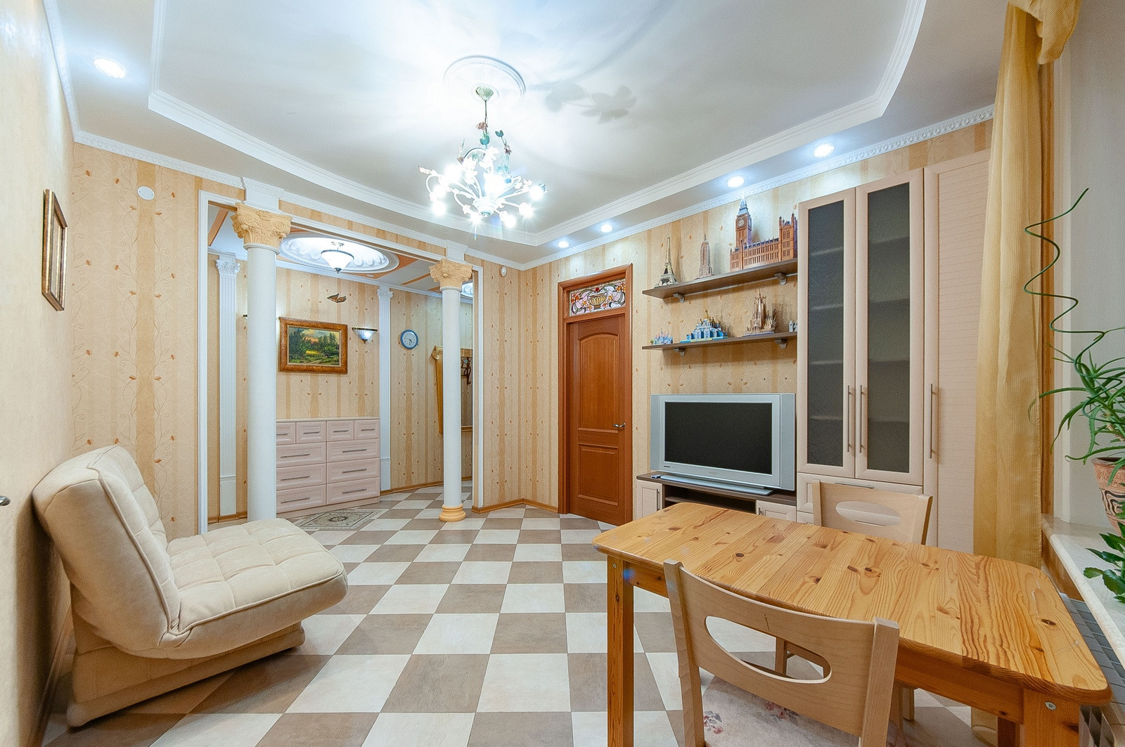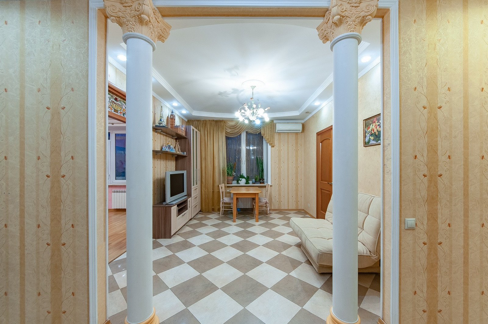 На общей площади 74 кв.м. функционально спланирована кухня, гостиная и две изолированные комнаты. Квартира, выполненная в стиле ампир. Застекленный балкон. Есть кладовка. В гостиной установлен кондиционер. Видеонаблюдение в подъезде. Мебель и оборудование только ведущих брендов. Потолки 3 метра. На этаже четыре квартиры.