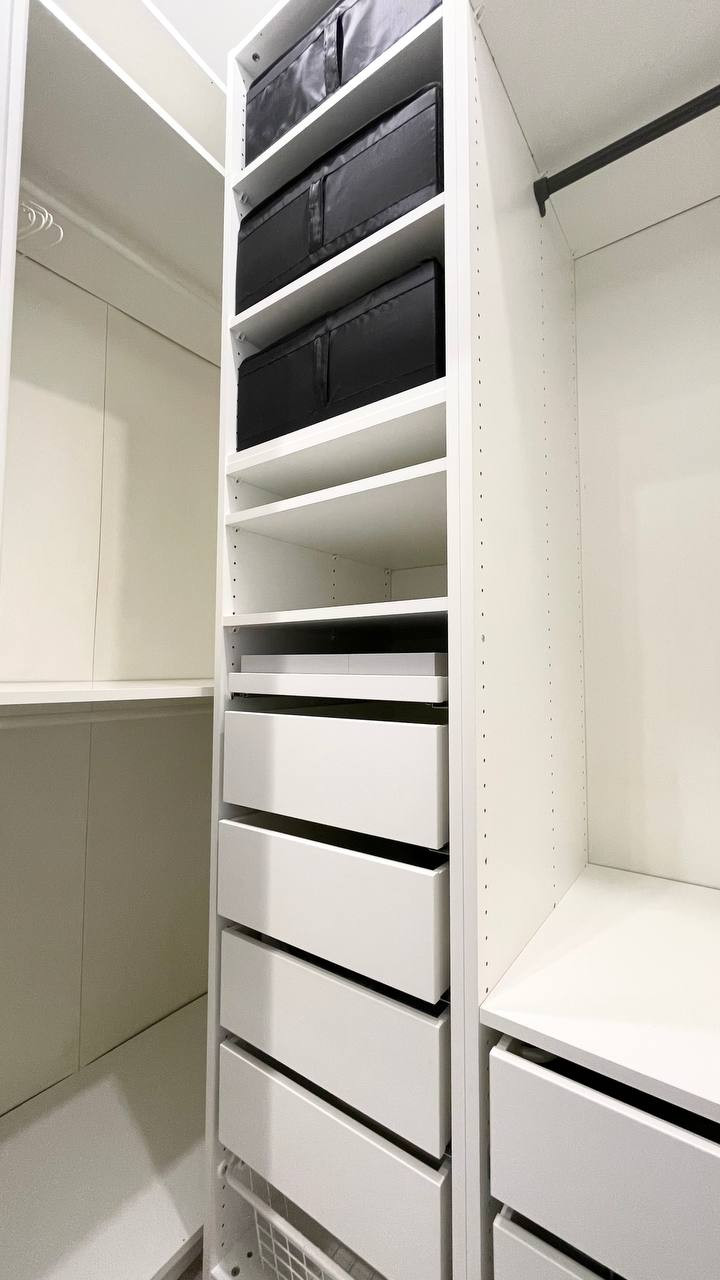 В гардеробной удобное и эргономичное пространство для хранения одежды.