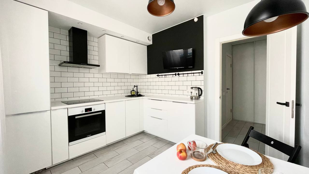 Кухня оборудована посудомоечной машиной, встроенным холодильником, духовкой, варочной панелью, столом с подвесными светильниками, которые создадут приятную атмосферу для тихих семейных вечеров и встреч с друзьями.