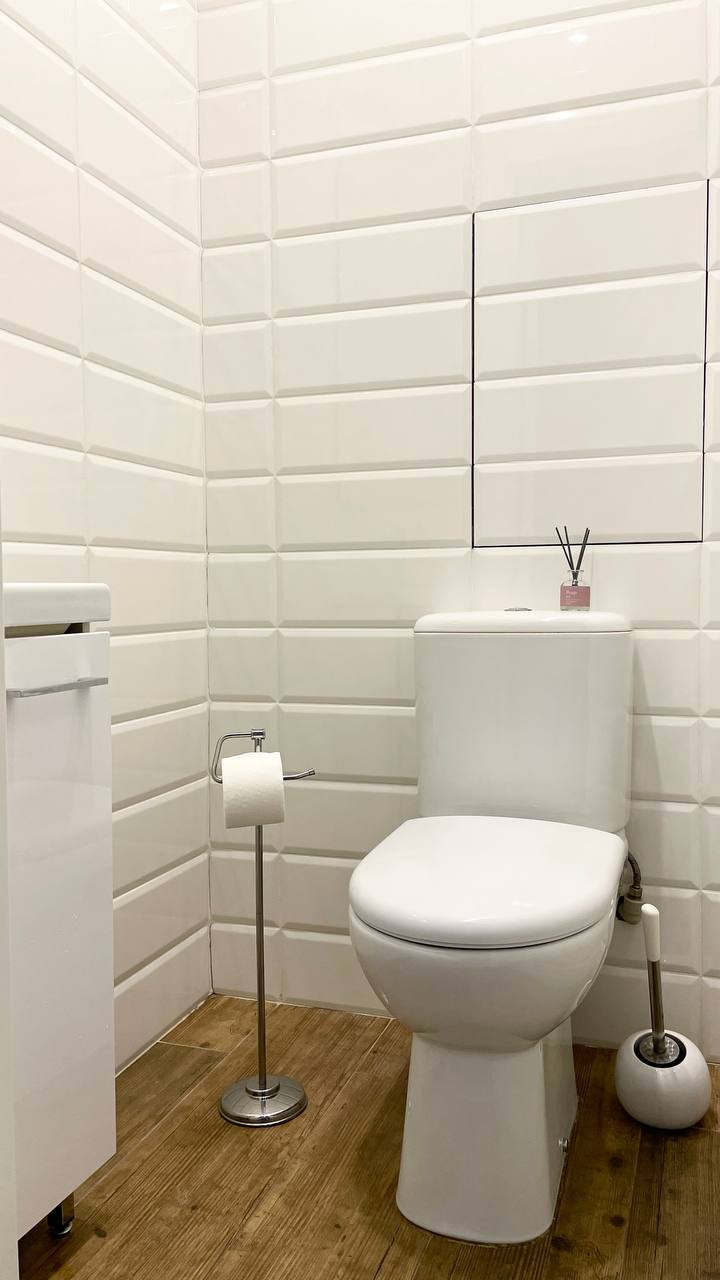 В уборной унитаз, тумба с мойкой.