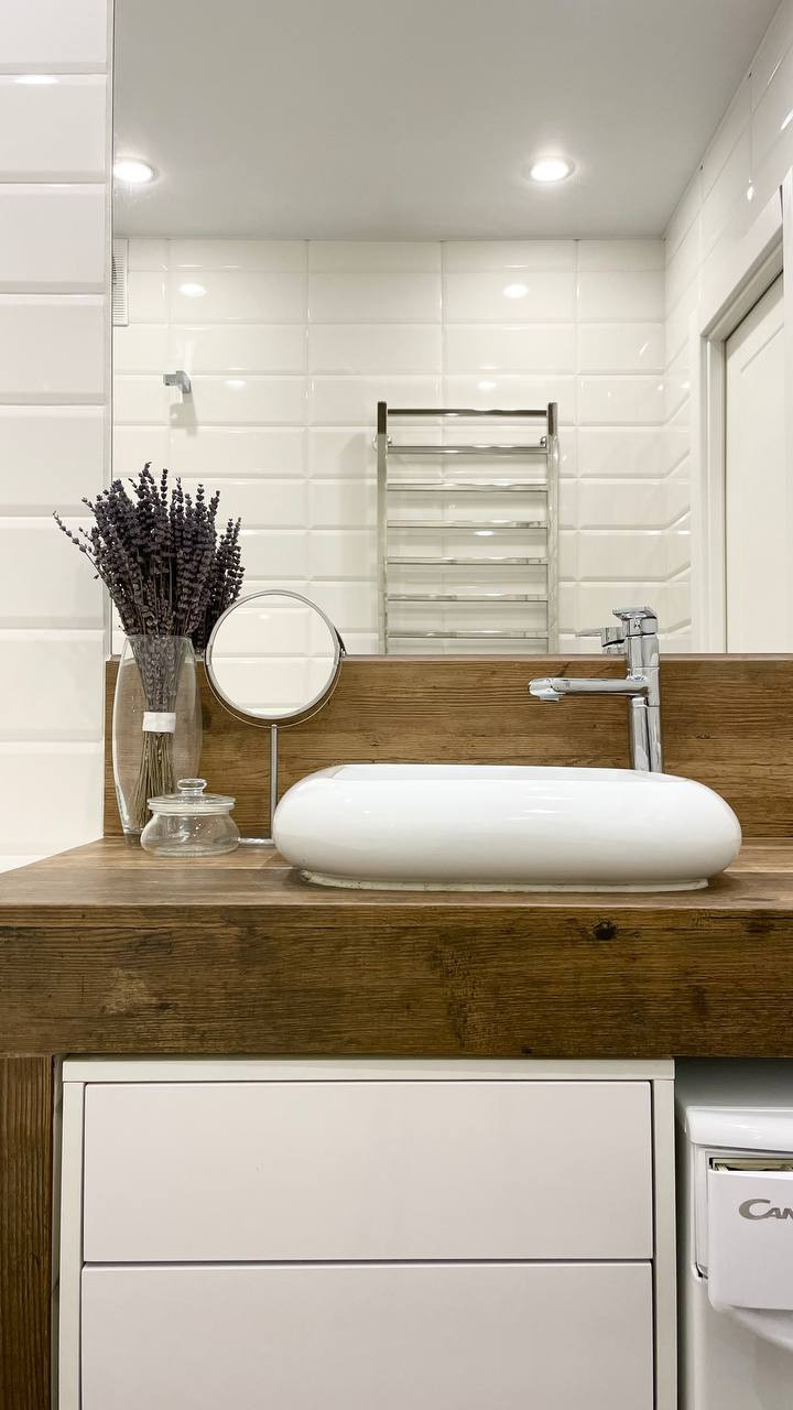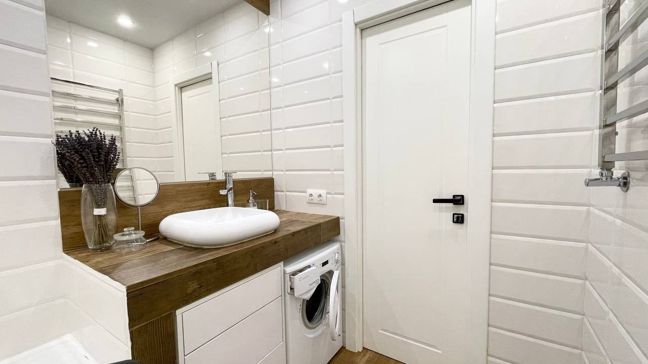 Санузел оснащен ванной, стир. машиной, тумбой и большим зеркалом.