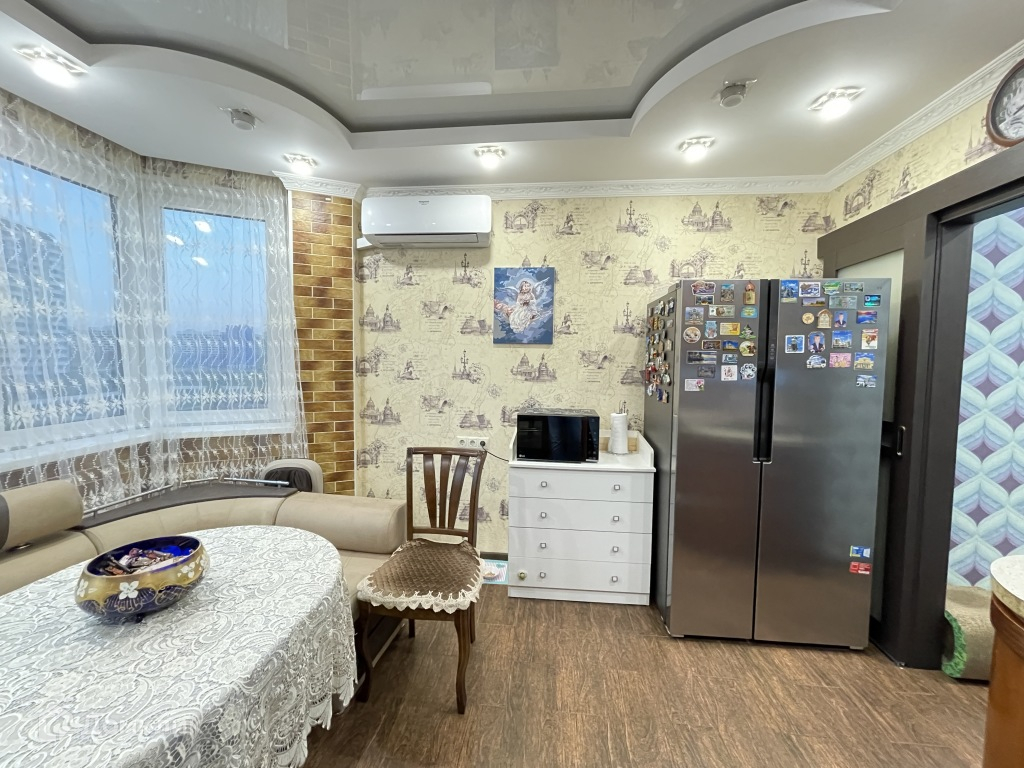 Ремонт делался для себя, использовались только качественные материалы: плитка керамическая, двухуровневые дорогие потолки, качественные двери, качественный ламинат высшей категории. Все комнаты изолированные, большой санузел,имеется закрытый балкон 3.8 кв.м в одной из комнат и лоджия 4.8 кв.м. совмещённая со спальней, где оборудована рабочая зона( кабинет). Большая кухня 12.9 кв.м с эркером.