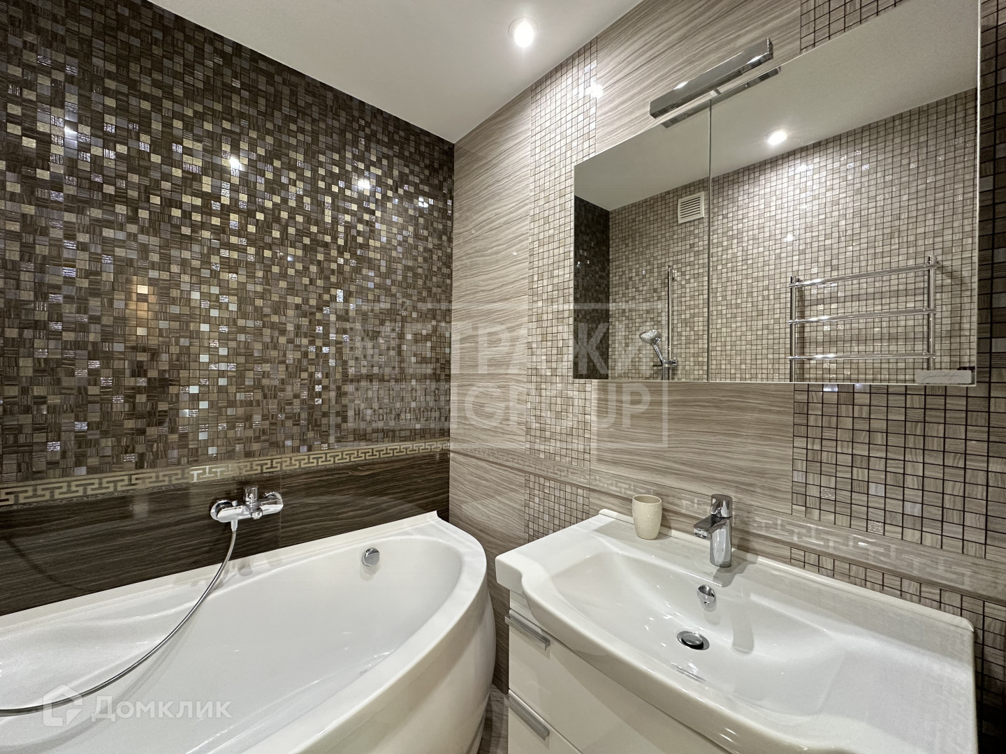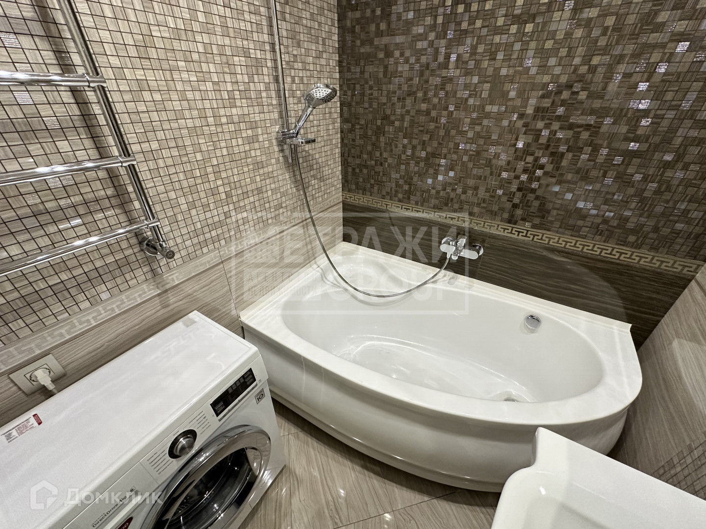 Просторный раздельный санузел с ванной, стиральной машинкой LG и мебелью. Вся сантехника Villeroy Boch и Hansgrohe, полы с подогревом.