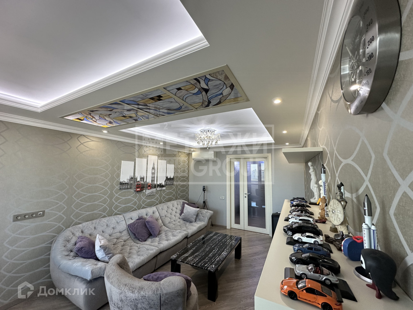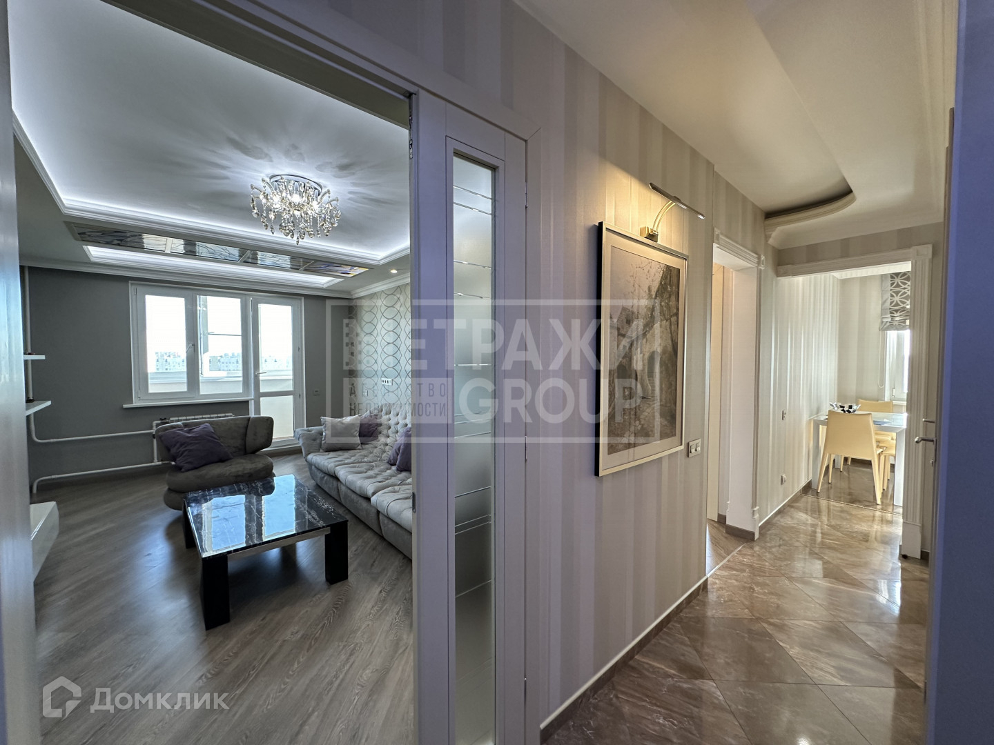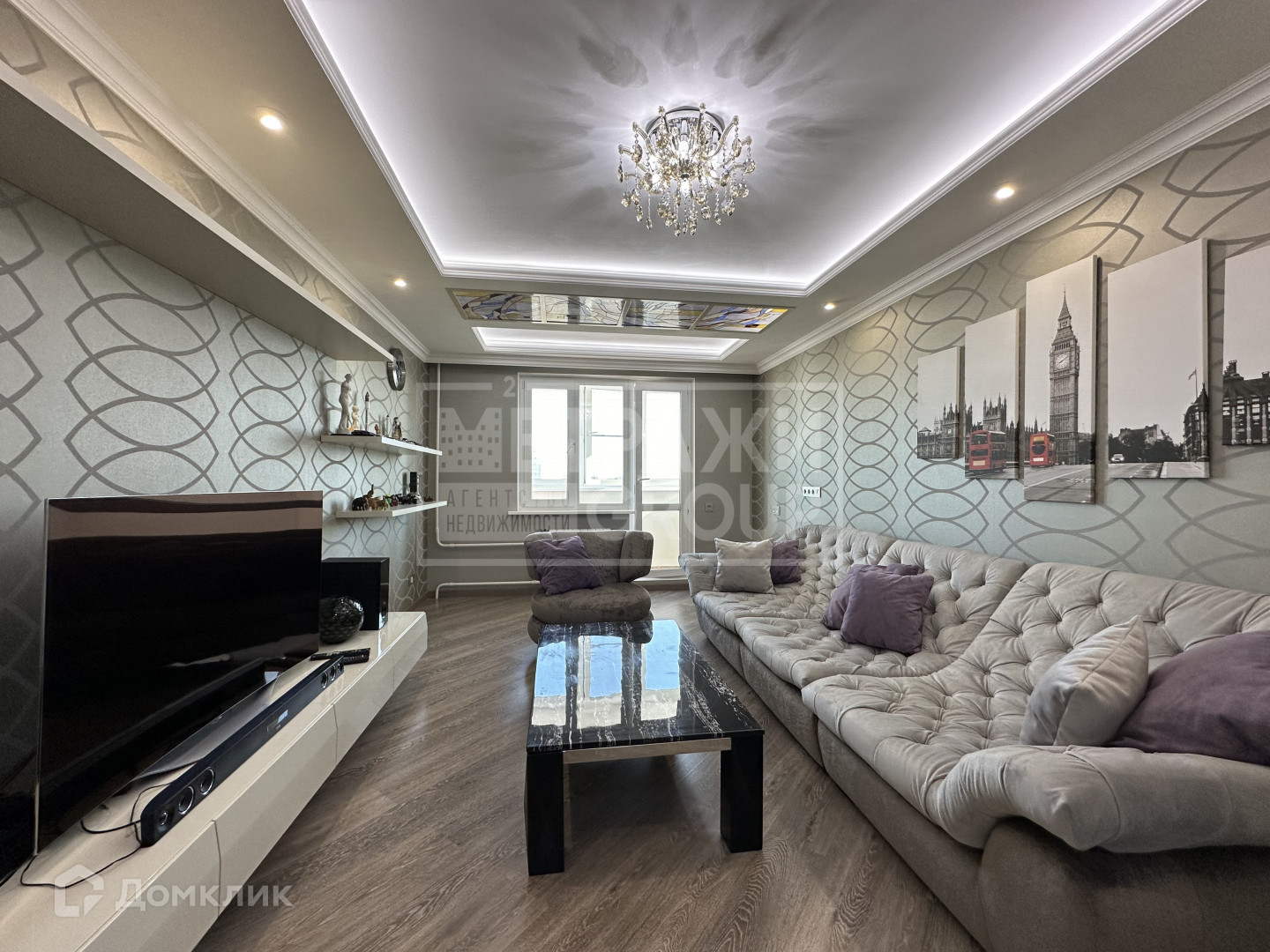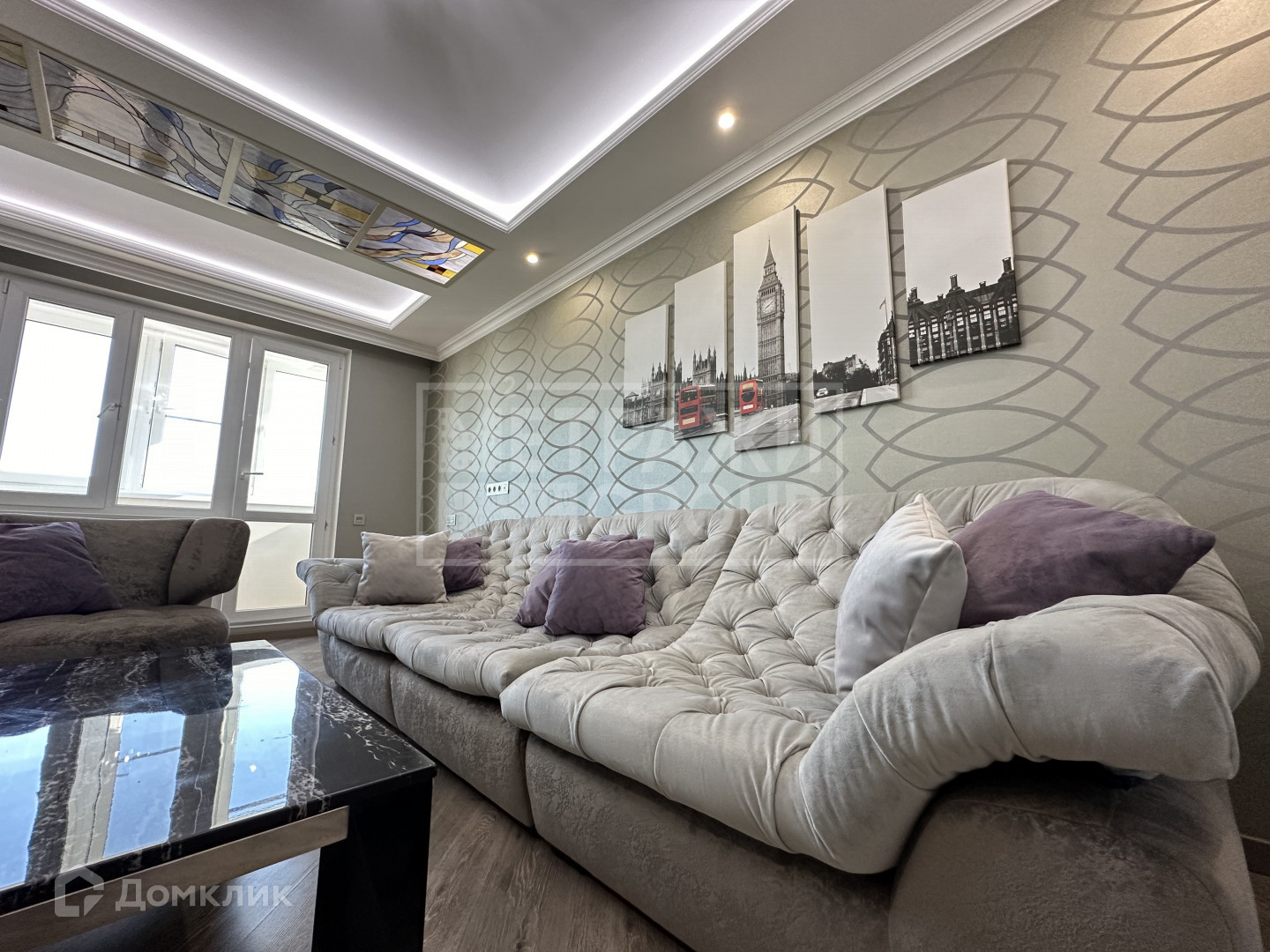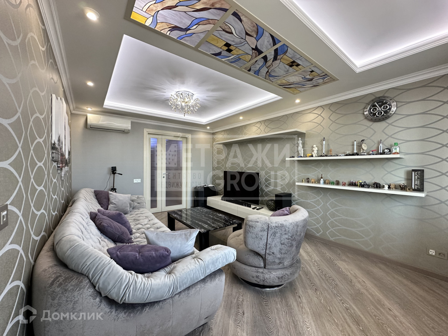 Общая площадь квартиры 65,2 кв.метров. Просторная уютная гостиная 18 кв.метров с мягким диваном и телевизором для проведения отдыха, красивый дизайнерский витраж на потолке, кондиционер, с выходом на застекленную лоджию (полы с подогревом).