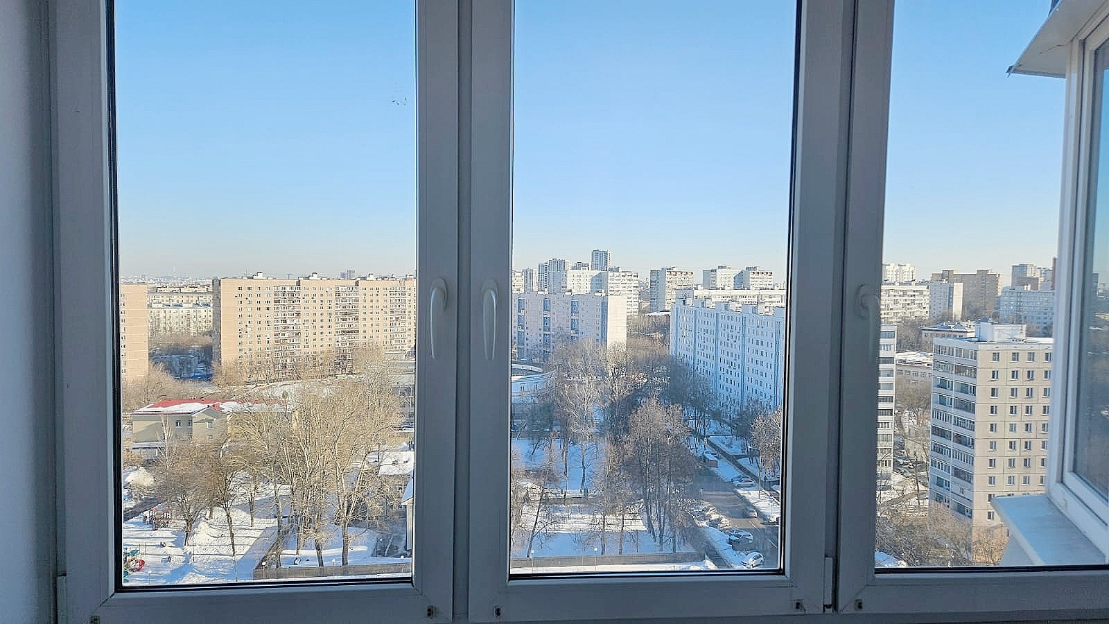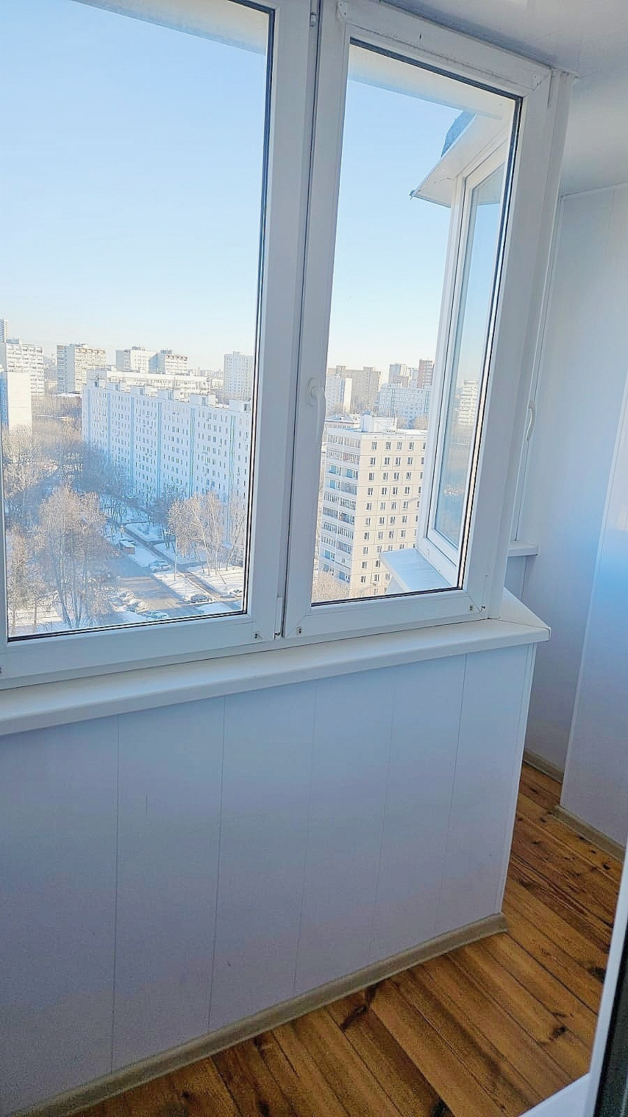 Балконные окна выходят на восток на Симферопольский бульвар, 3 других окна на запад во двор на сквер.