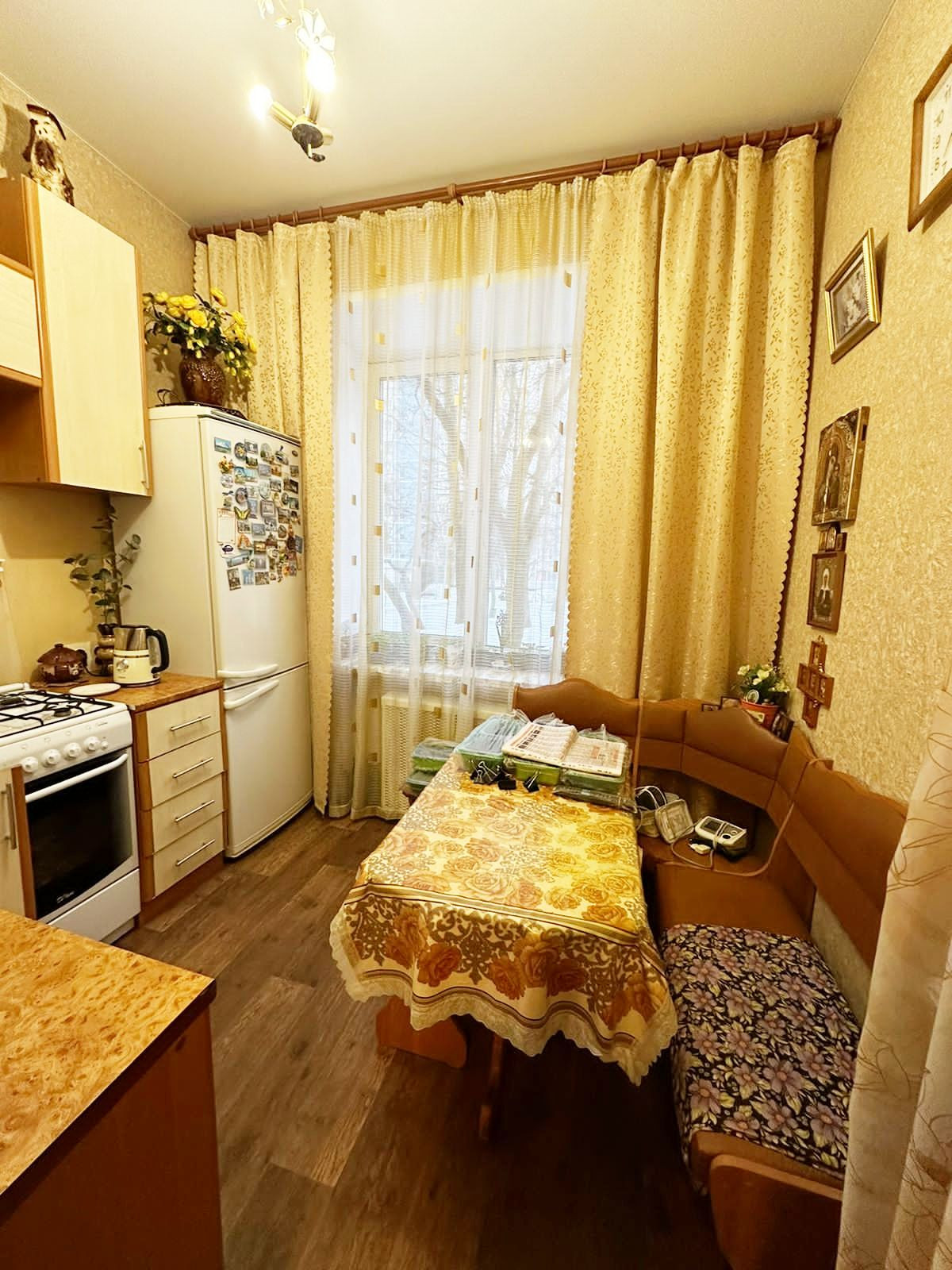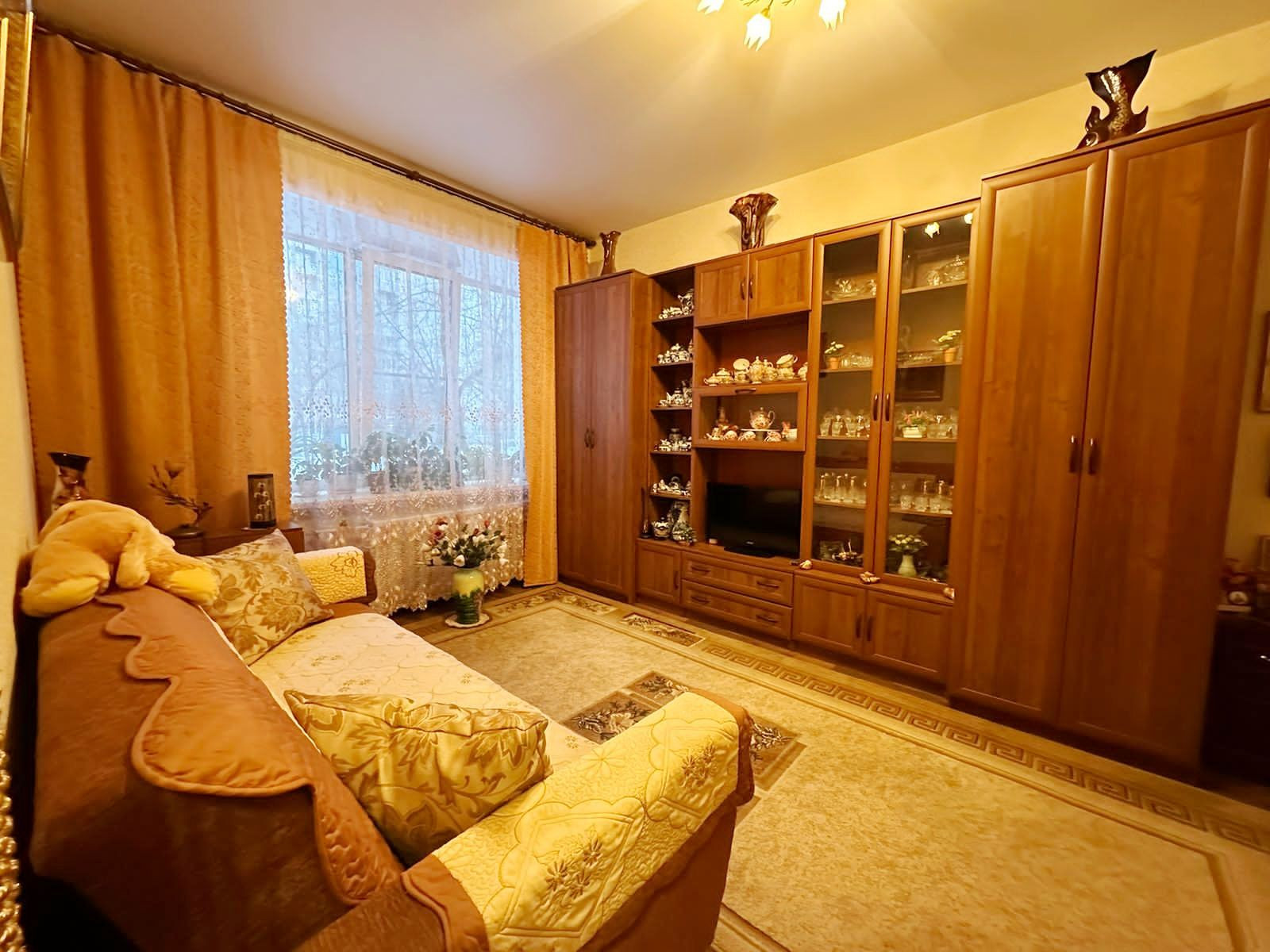 Квартира действительно очень уютная, с хорошей энергетикой. Просторная комната, комфортная кухня, кухня меблирована, высокие потолки (3 м) . Квартира в хорошем, жилом состоянии, на окнах - пластиковые стеклопакеты, металлическая дверь.