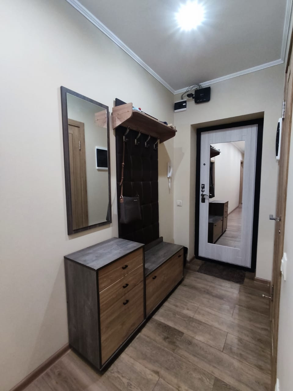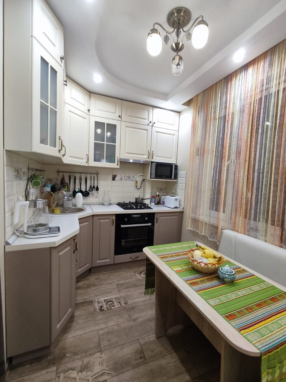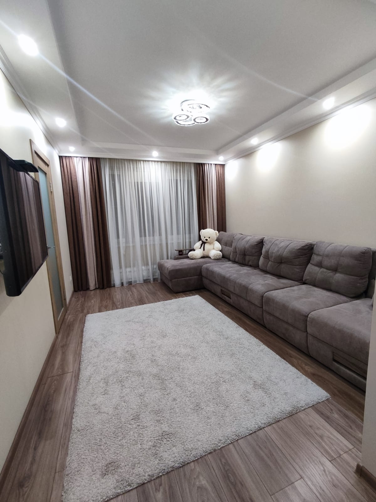 Квартира ухоженная с новым ремонтом, в ней имеются 3 комнаты: большой зал с 4-хметровым удобным раскладным диваном, каждая секция которого оборудована ящиками; светлая уютная спальня с большой кроватью, угловым шкафом,  прикроватной тумбой и тумбой для ТВ; детская комната, в которой окно и балконная дверь имеют защитные замки, чтобы ребёнок сам не открыл, все розетки также с защитой. Застеклённая окнами rehau лоджия имеет пол с подогревом, при желании можно включать в зимнее время года, имеется удобная вешалка для сушки белья, в лоджии была сделана гидроизоляция. Кладовая оборудована полками, гардеробом и антресолями. Совмещённый просторный санузел (при ремонте был поменян стояк и произведена гидроизоляция); в ванной комнате находится канадская большая душевая кабина с глубоким поддоном 130 на 100 см, в котором можно принимать ванну. Также в ванной комнате располагается большой шкаф с полками, бельевой корзиной, отделом для стиральной машинки и отсеком для химсредств. Кухня со встроенной техникой, нишей для холодильника, мягким кухонным гарнитуром и столом.