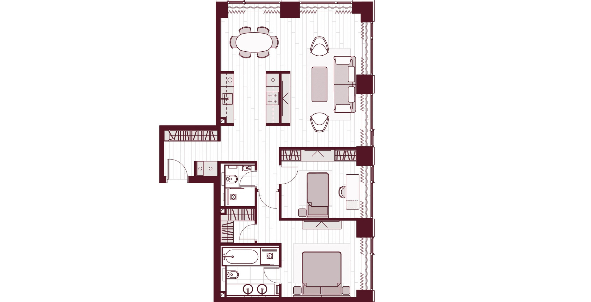 Удобная планировка включает: большую гардеробную, кухню, гостиную, мастер-спальню, вторую спальню, 2 санузла.