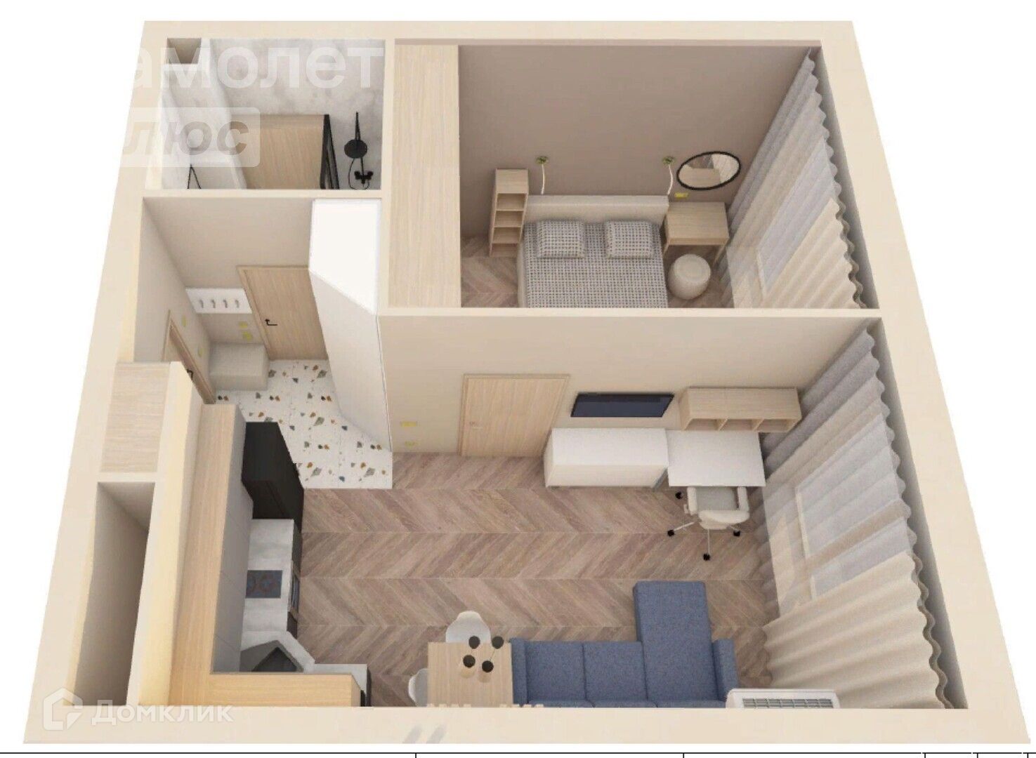 Корпус 1 MADISON. Дом сдан в 3 квартале 2023, ключи получены, право собственности оформлено. Полноценная спальня - 12 кв.м, кухня-гостиная - 20 кв.м, совмещенный санузел - 3,6 кв. м, кладовая -0,5 кв.м, прихожая.