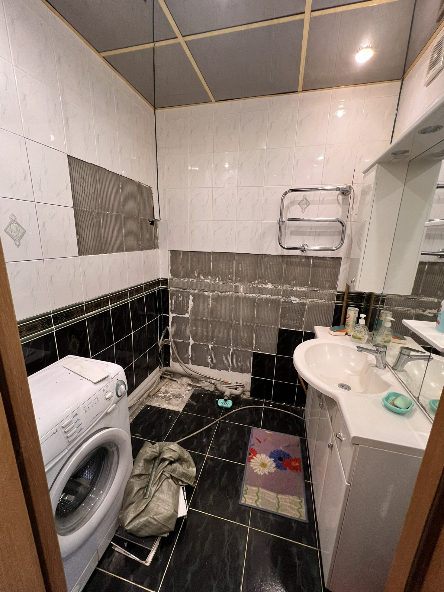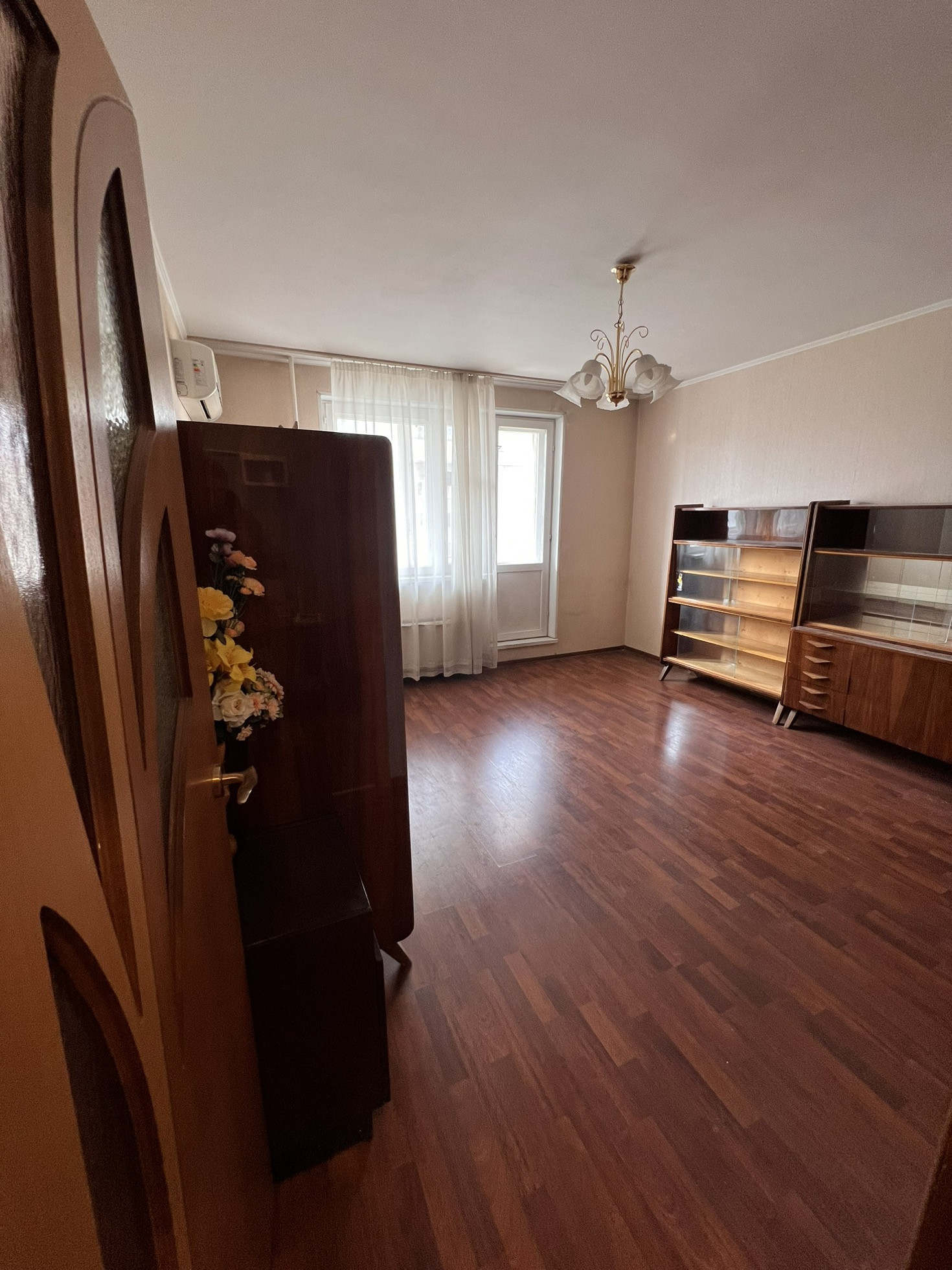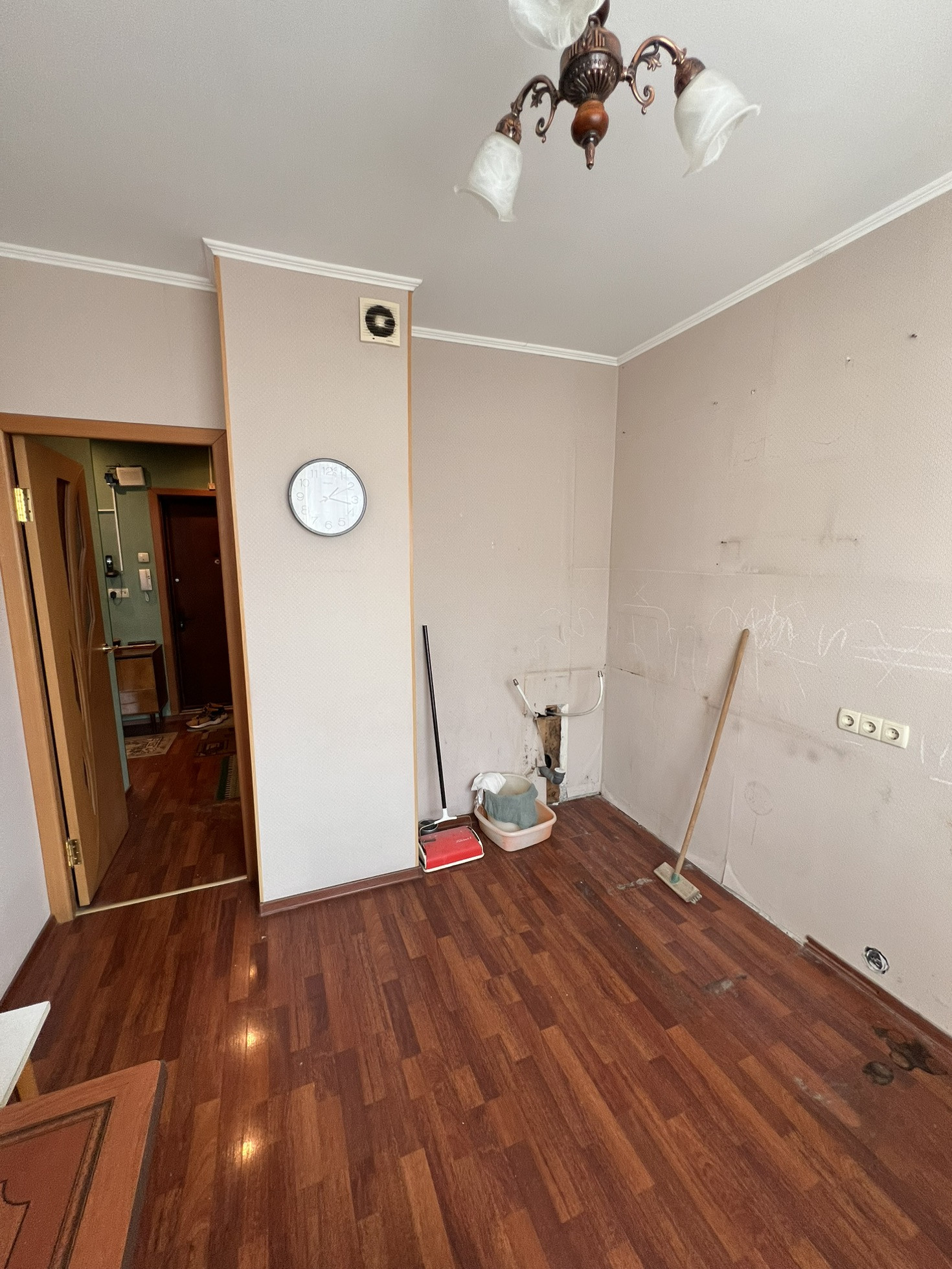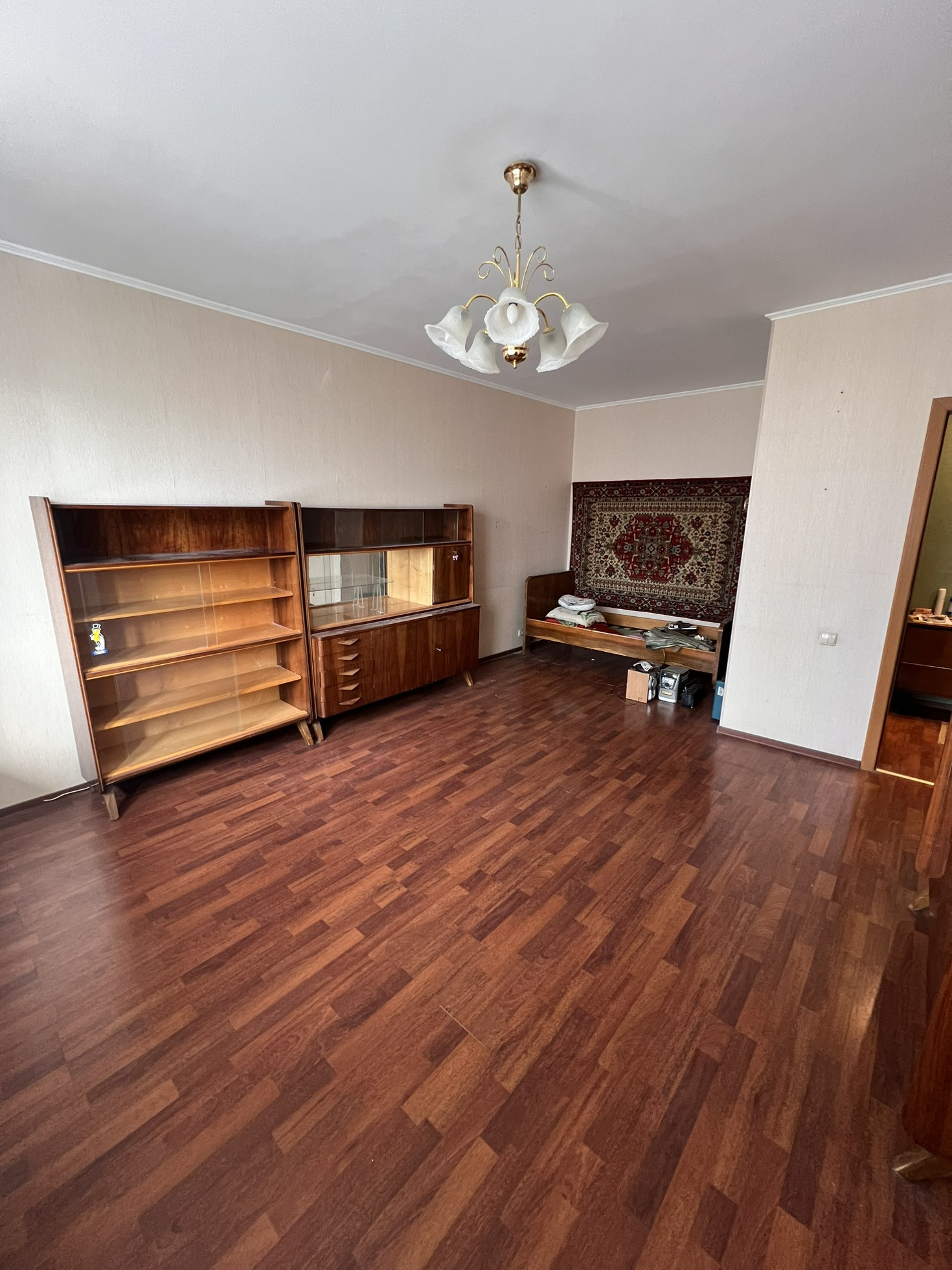 В квартире хорошие ровные белые потолки, ровные полы и стены, из квартиры утилизирован старый кухонный гарнитур, старая душевая кабина и частично утилизирована старая мебель из комнаты.