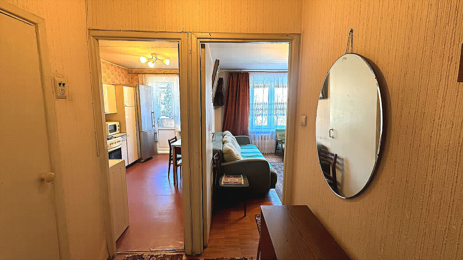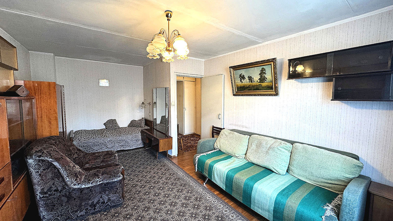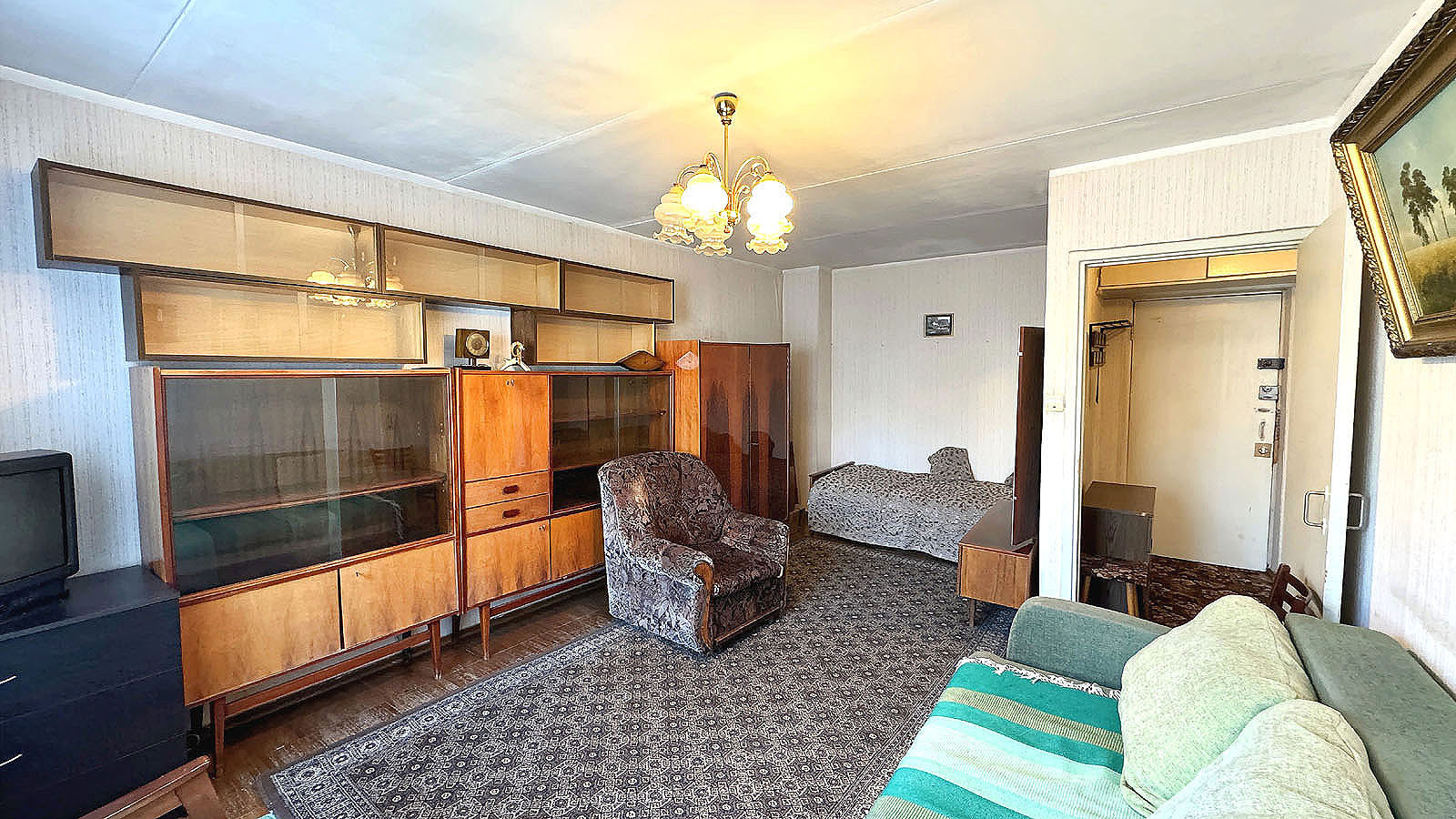 Однокомнатная квартира, 34.9/20/9.7, окна во двор. Квартира в жилом состоянии, просторная комната с альковом, стеклопакеты установлены, в остальном - требует ремонта, но можно жить и так (смотрите фото). Мебель можем оставить или вывезти.