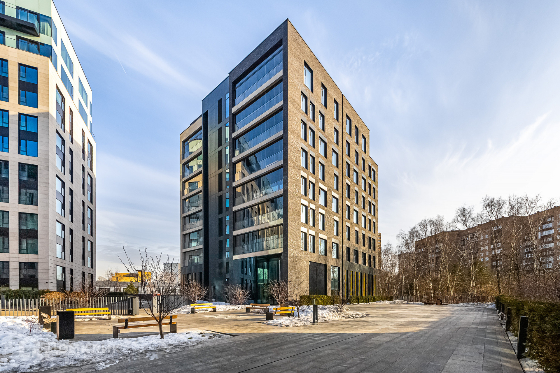 На благоустроенной закрытой территории есть вишневый сад с беседками и фонтанами, зеленые дворы с террасами для квартир на первых этажах, поле для игры в городки, спортивная площадка, уличная шахматная доска, большая и малая детские площадки. Предусмотрен прямой выход в парк.