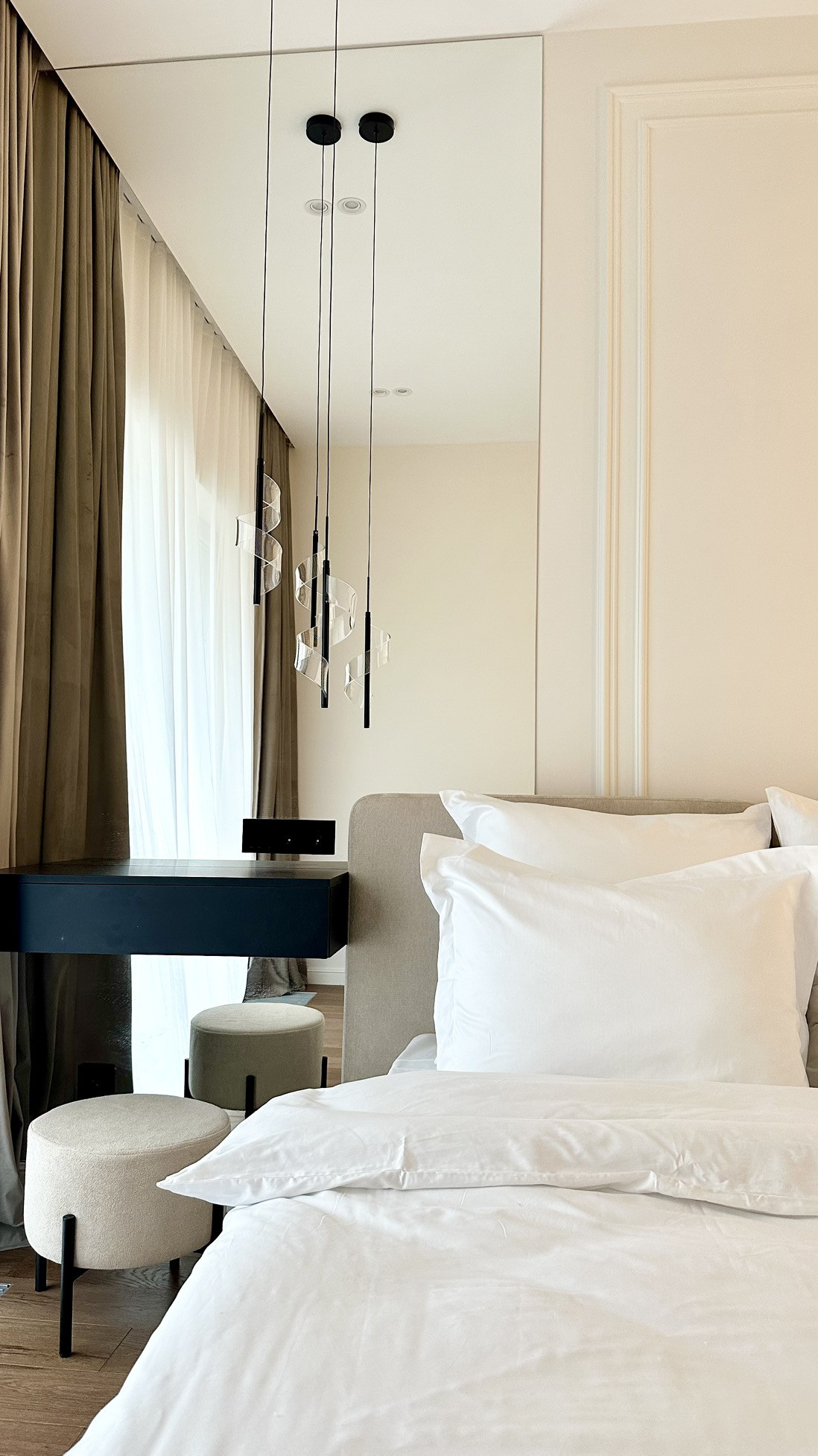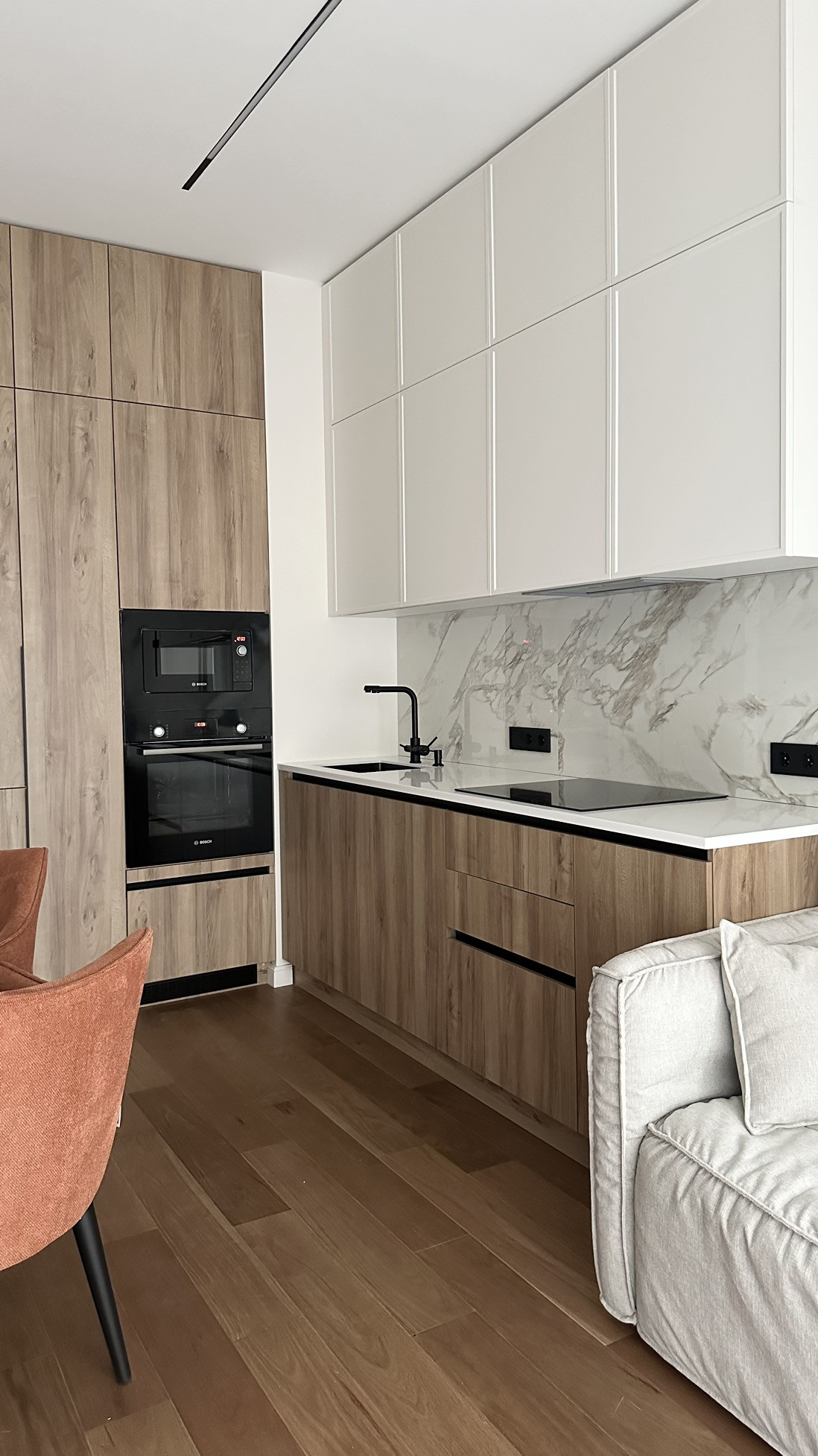 В апартаментах сделан стильный качественный ремонт - на полу натуральное дерево, европейская сантехника, радиаторы заменены на внутрипольные, мягкая и корпусная мебель на заказ, техника Liebherr, Bosch, Samsung, сам интерьер долго будет в тренде
