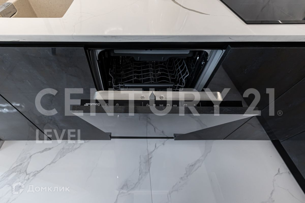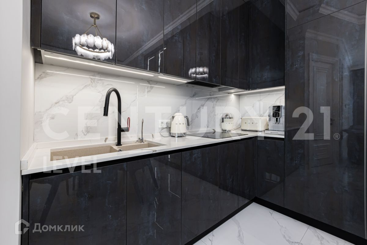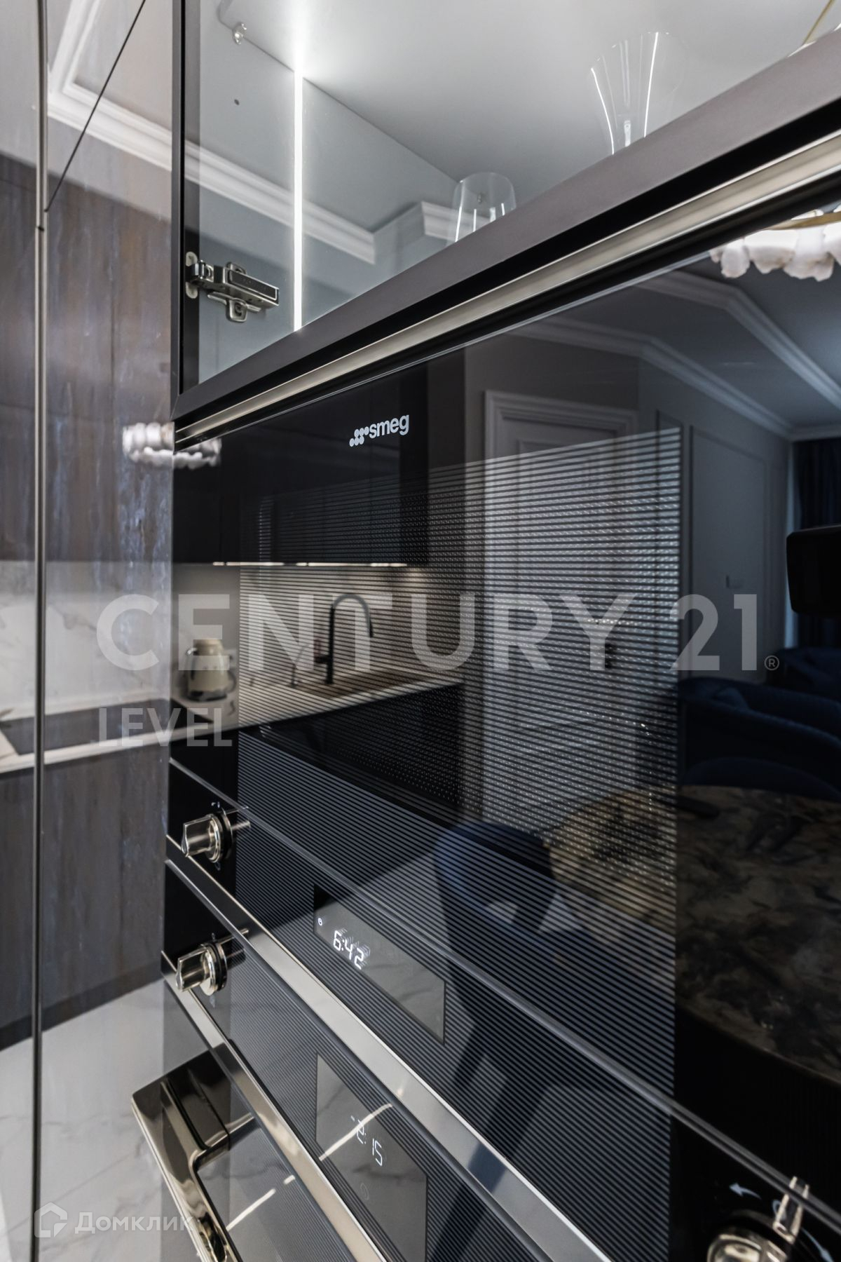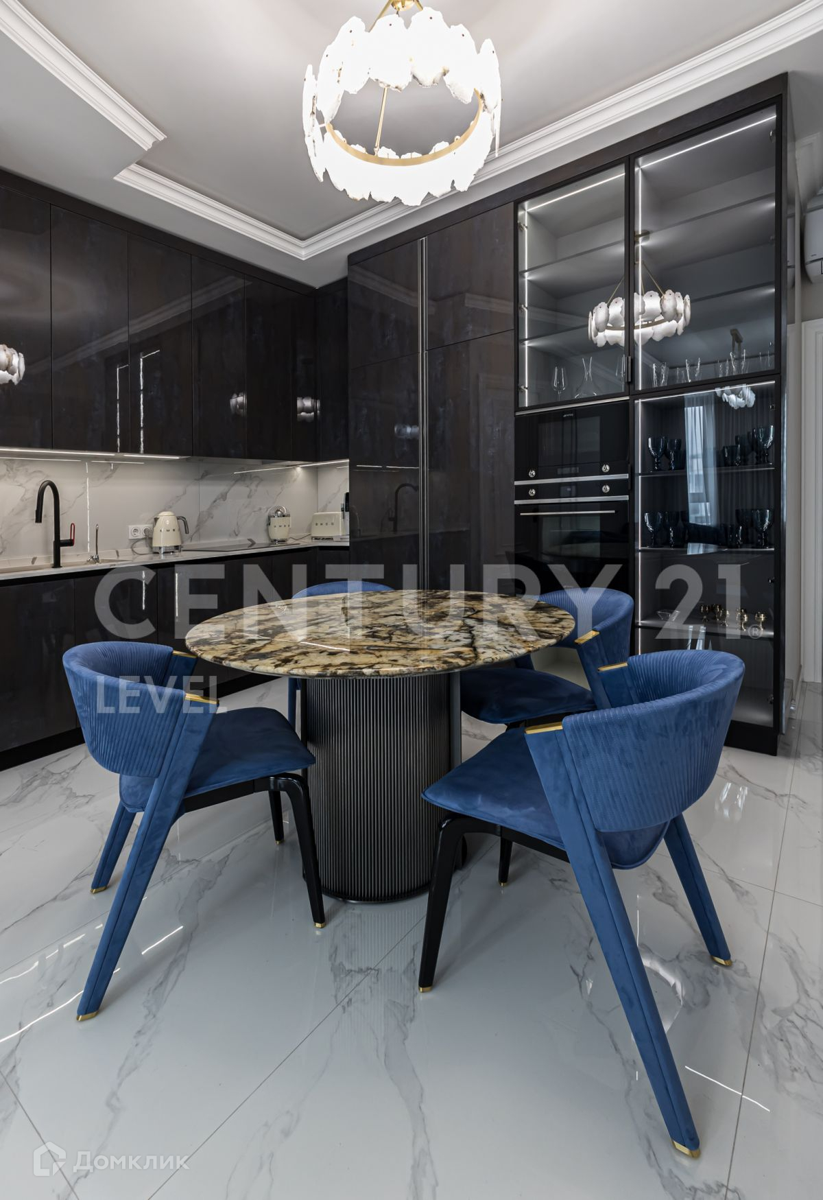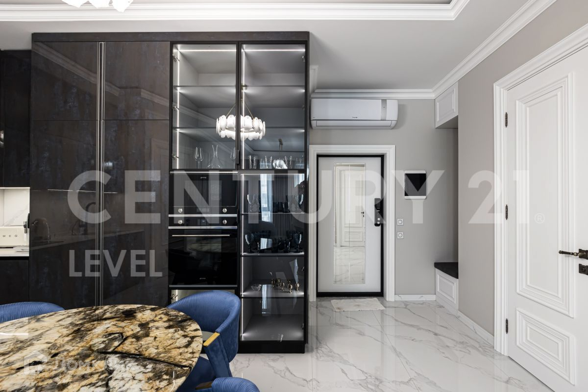 Современный дизайн кухни компании OPPEIN, вся фурнитура кухни BLUM. Вся встроенная техника Smeg: холодильник, духовой шкаф, микроволновка, посудомоечная машина, варочная панель, мелкая бытовая техника. Дизайнерский кухонный стол и журнальный столик в кухне-гостиной выполнен в одном стиле из натурального мрамора. Итальянская мебель компании Cornelio Cappellini с тканевой структурой Napa выкуплена и привезена с выставки. Установлены дорогие межкомнатные двери высотой 2,3 м известной компании Geona, изготовленные по заказу.