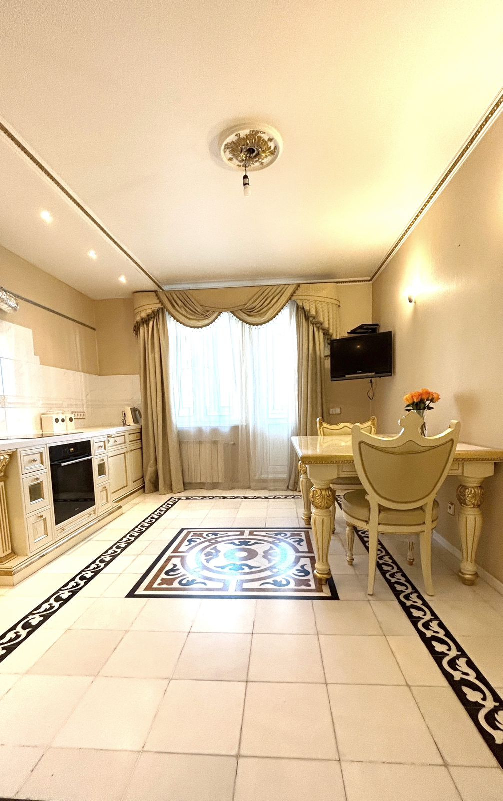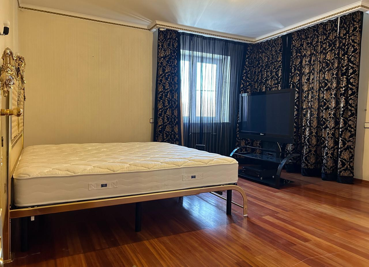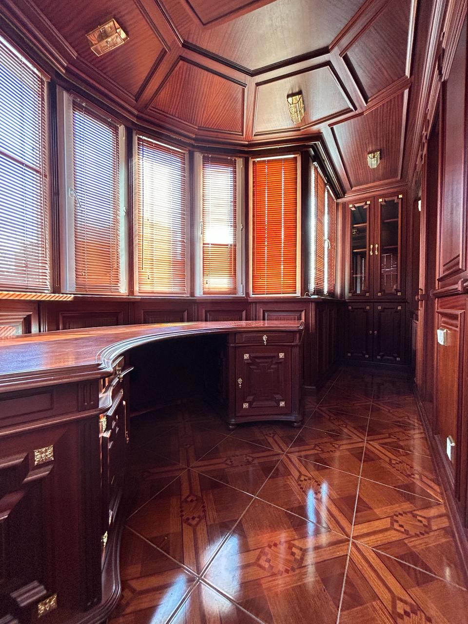Квартира с окнами в зелёный тихий двор с дизайнерским ремонтом в классическом стиле. В отделке использованы исключительно премиальные натуральные материалы: пол из итальянского художественного мрамора ручной работы и массива африканского дерева дуссия, превосходящего в разы качество дуба; шёлковые обои; готовая гардеробная из массива дерева; кабинет, выполненный компанией «Luxury Home» по индивидуальному заказу из массива красного дерева с итальянской фурнитурой и хрустальными светильниками.