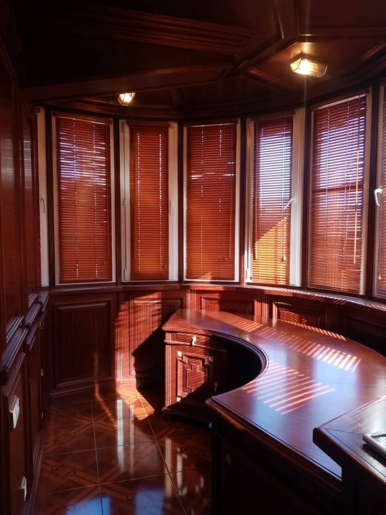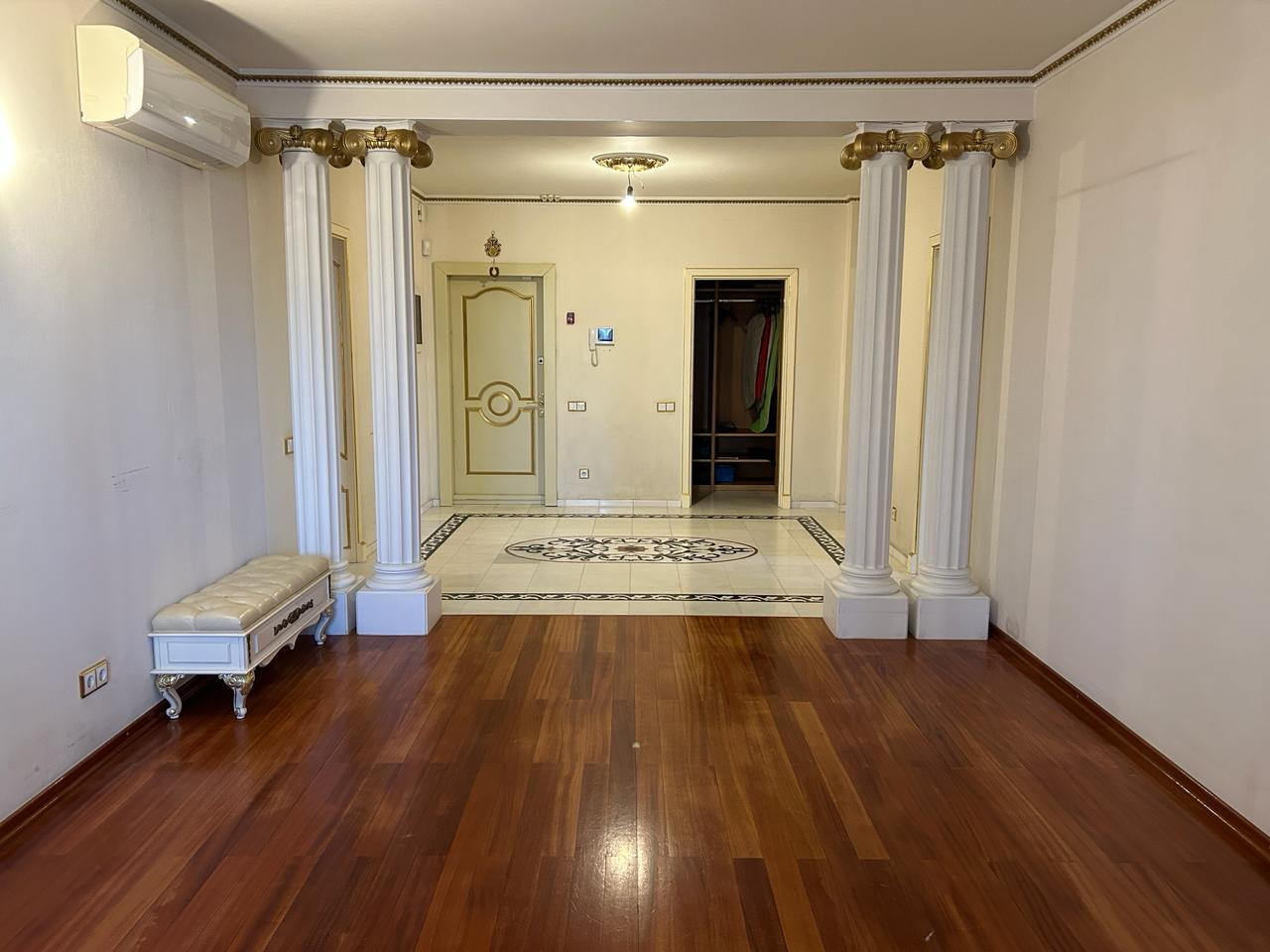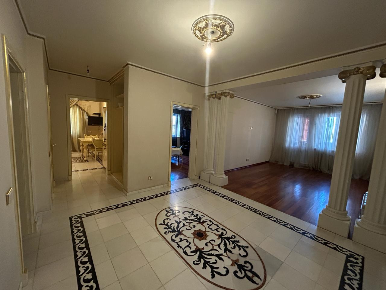 Квартира с окнами в зелёный тихий двор с дизайнерским ремонтом в классическом стиле. В отделке использованы исключительно премиальные натуральные материалы: пол из итальянского художественного мрамора ручной работы и массива африканского дерева дуссия, превосходящего в разы качество дуба; шёлковые обои; готовая гардеробная из массива дерева; кабинет, выполненный компанией «Luxury Home» по индивидуальному заказу из массива красного дерева с итальянской фурнитурой и хрустальными светильниками.