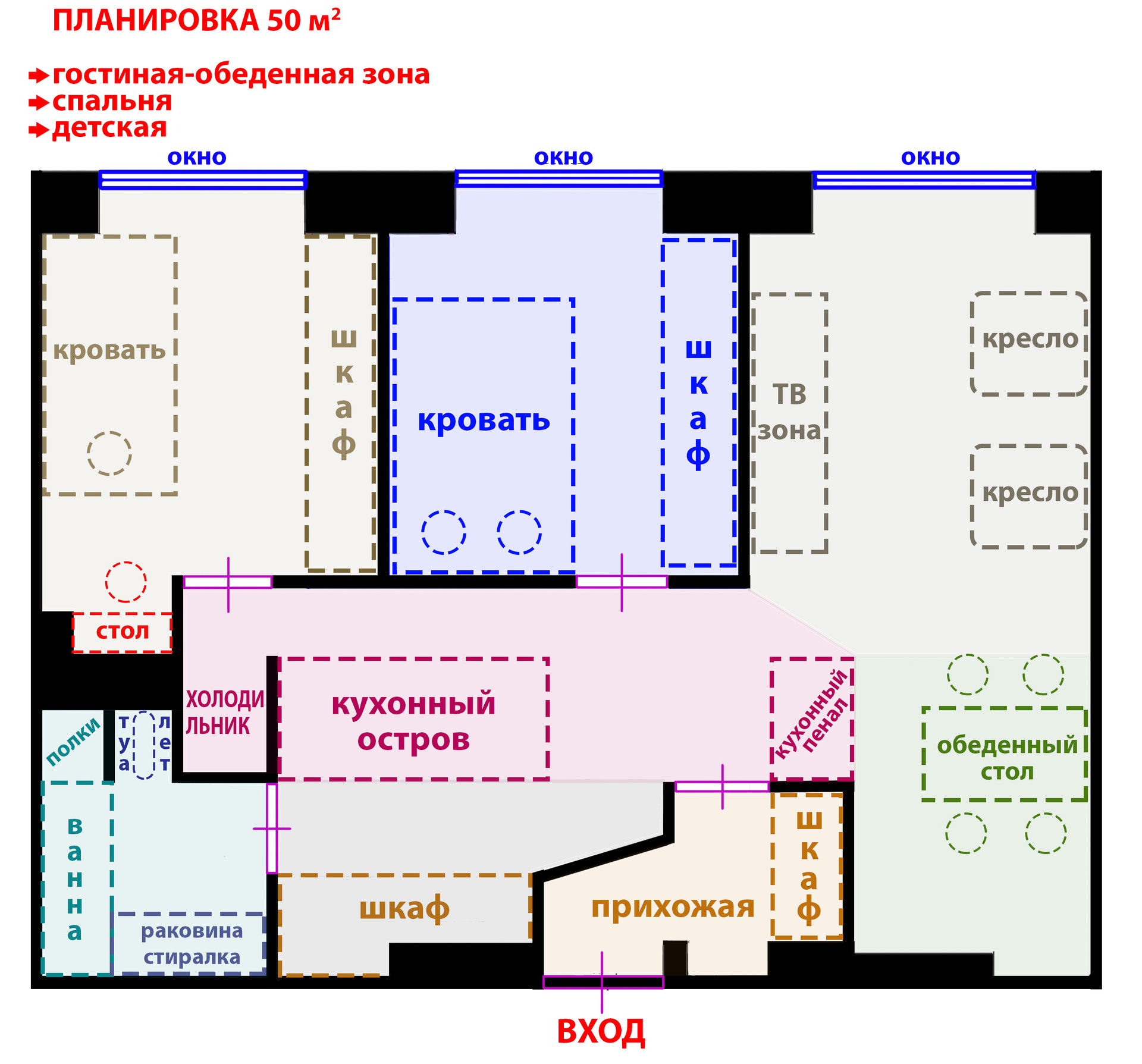 За счёт продуманной планировки используется каждый метр: зонирование на прихожую, кухонное пространство в форме острова, обеденную и гостиную зоны, изолированную спальню и изолированный кабинет/детскую, и санузел. Застройщики обычно называют такие варианты евро-трёшка.