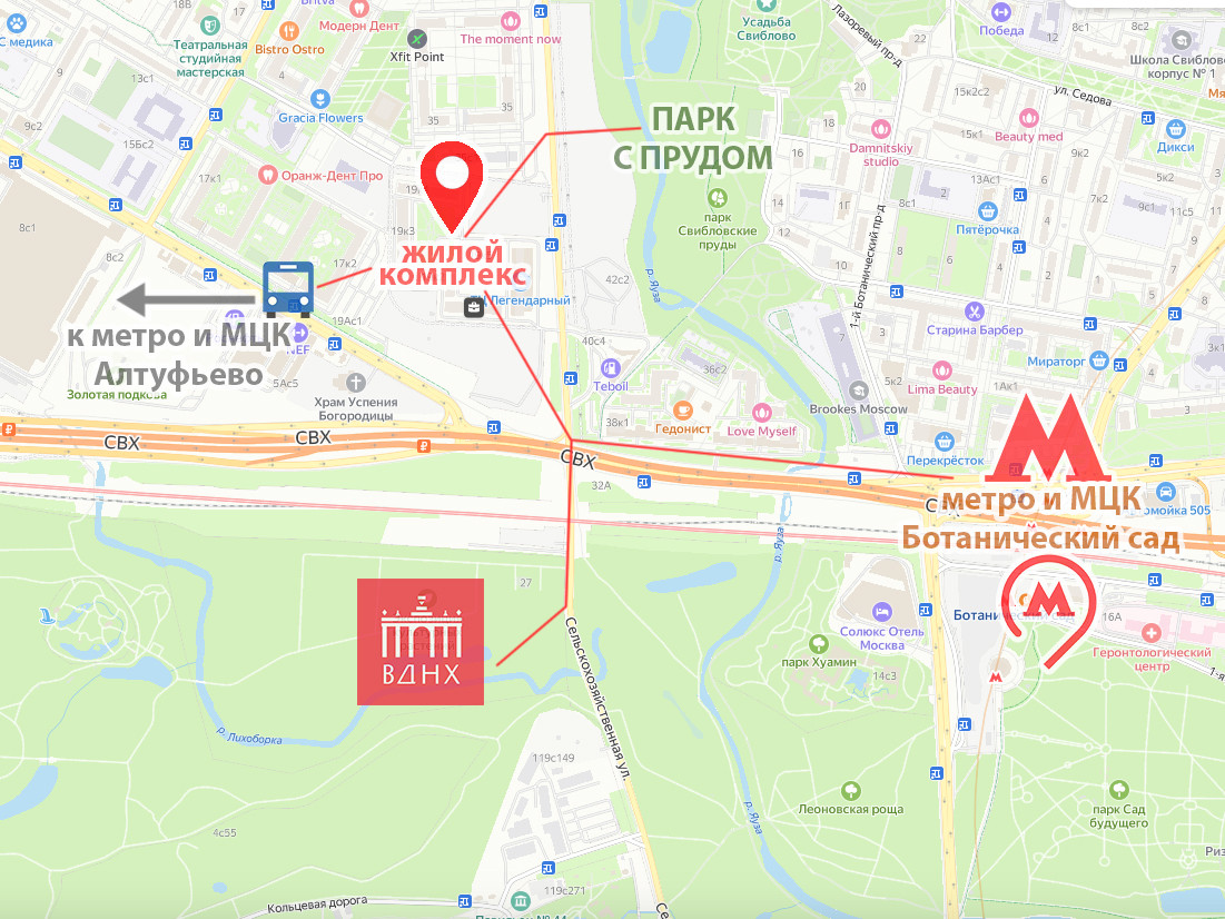 м.Ботанический сад в 1.4 км примерно 15 минут пешком, там же МДЦ Ботанический сад. От метро курсирует 3 маршрута автобусов прямо до жилого комплекса.