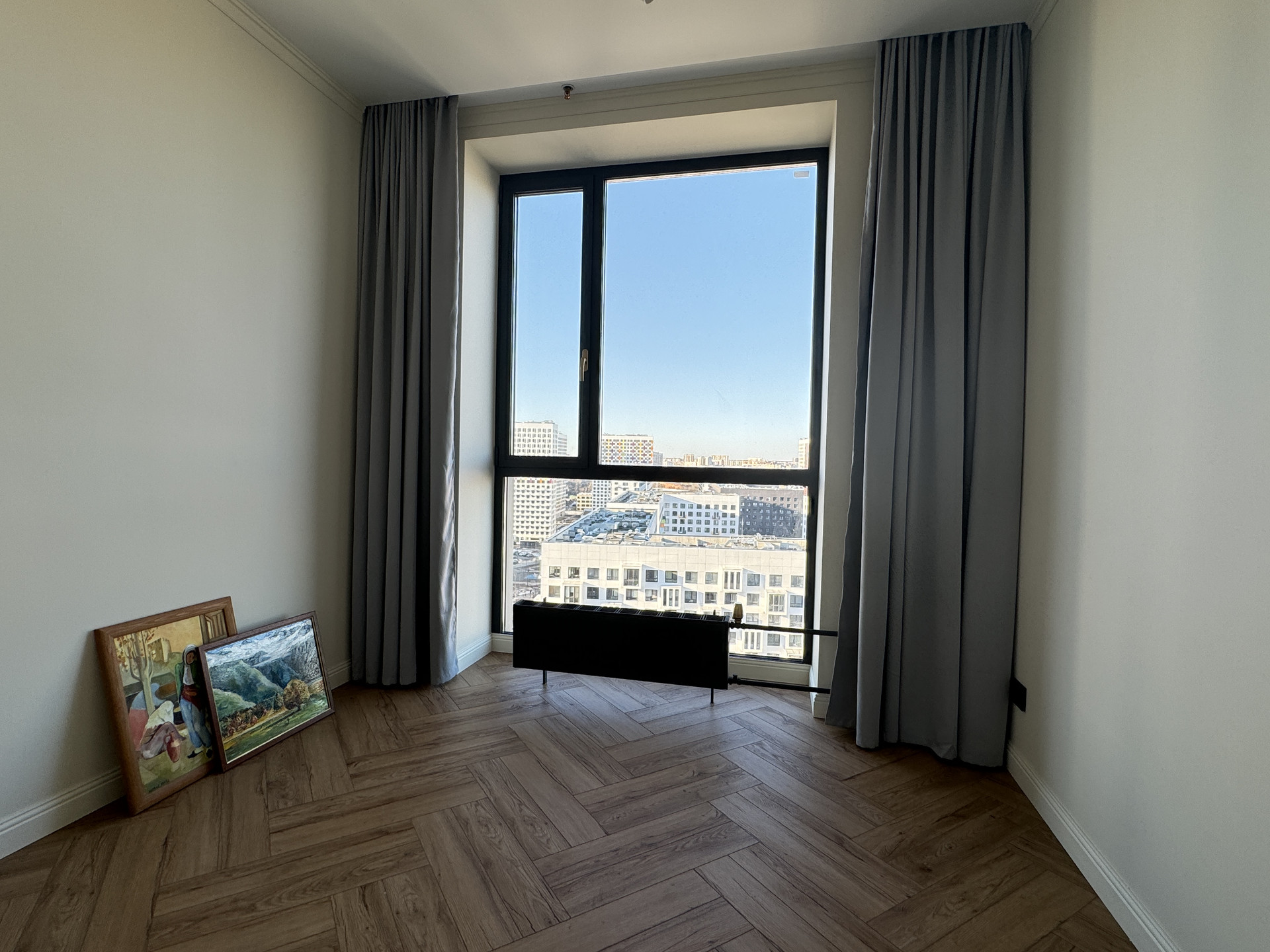 Апартамент расположен на 17 этаже, окна выходят на север в стороны ЖК Грин Парк и лесопарковой зоны с прудом. Только 3 самых высоких этажа имеют панорамные окна в пол - наш этаж как раз относится к таковым, что делает апартамент очень светлым.