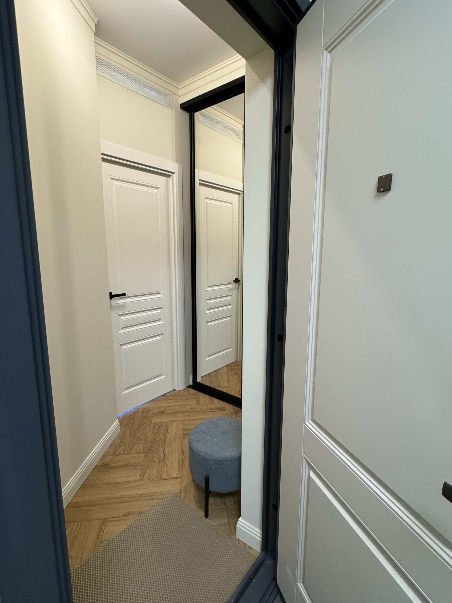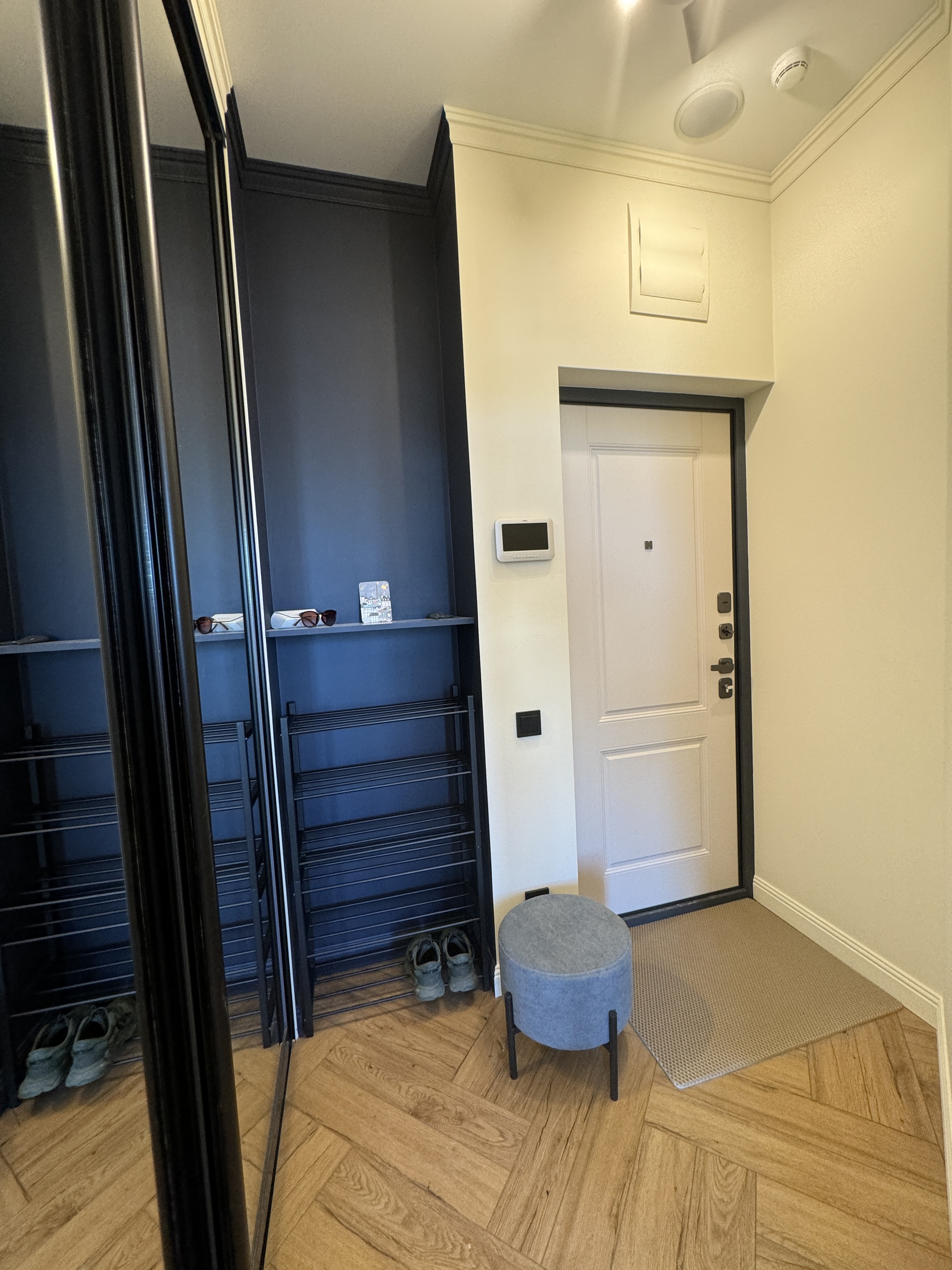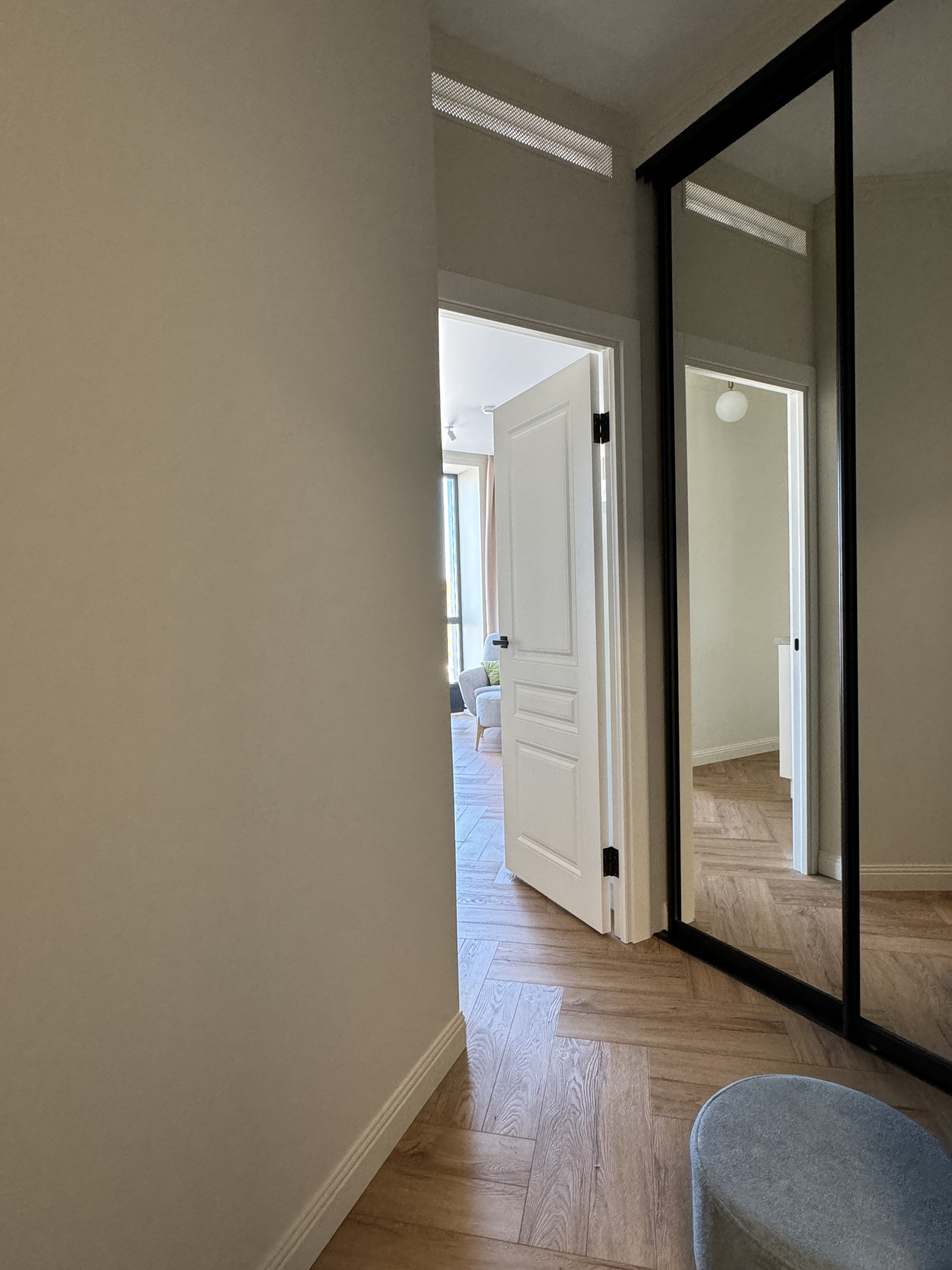 Из мебели: два зеркальных шкафа с системой хранения, кровать с матрасом, обеденный стол и стулья, 2 кресла и пуфик, ТВ тумба, шторы блекаут во всех комнатах. В санузле полноценная ванна 170х70 см и смеситель с терморегулятором, унитаз с инсталляцией.