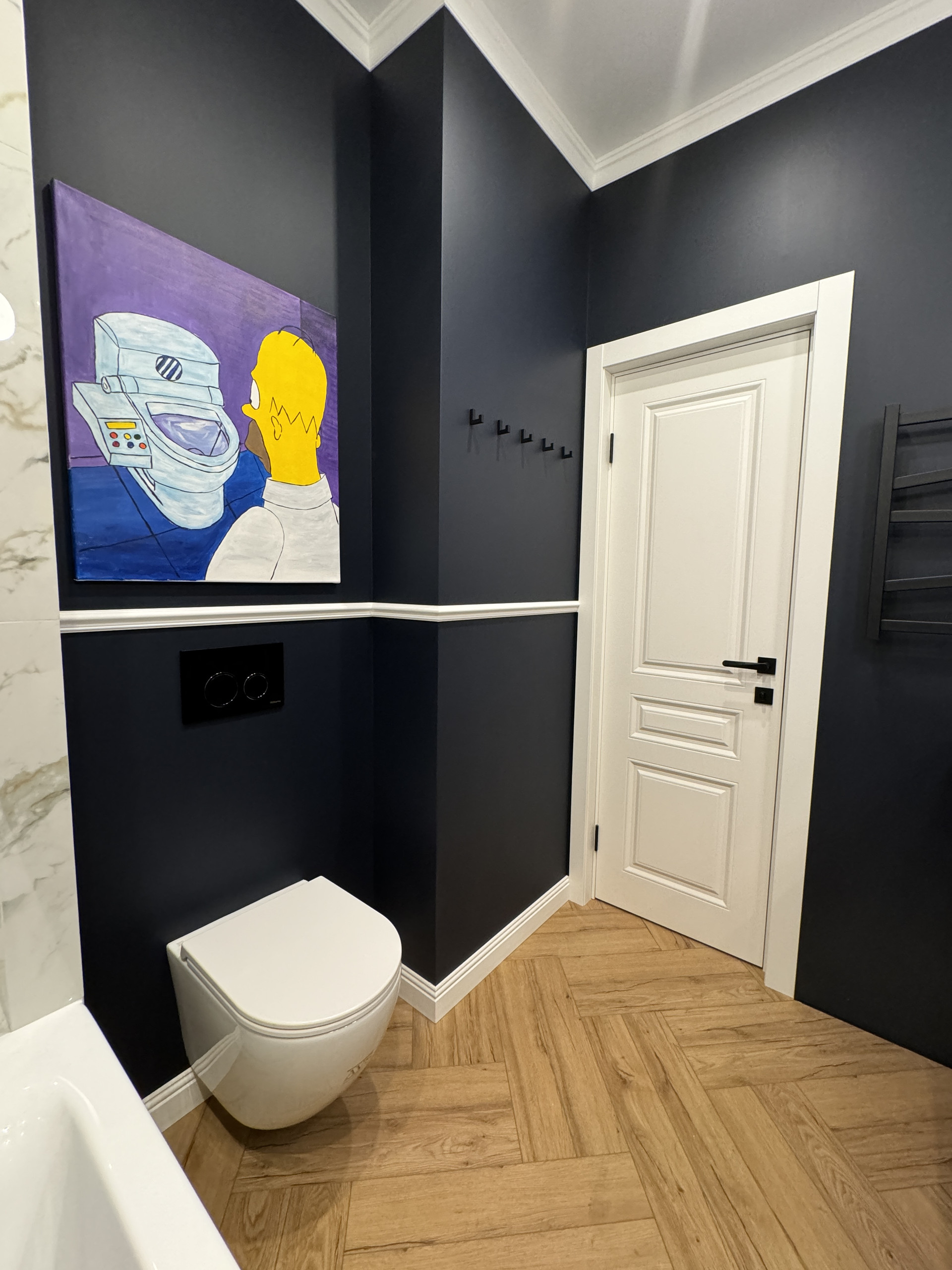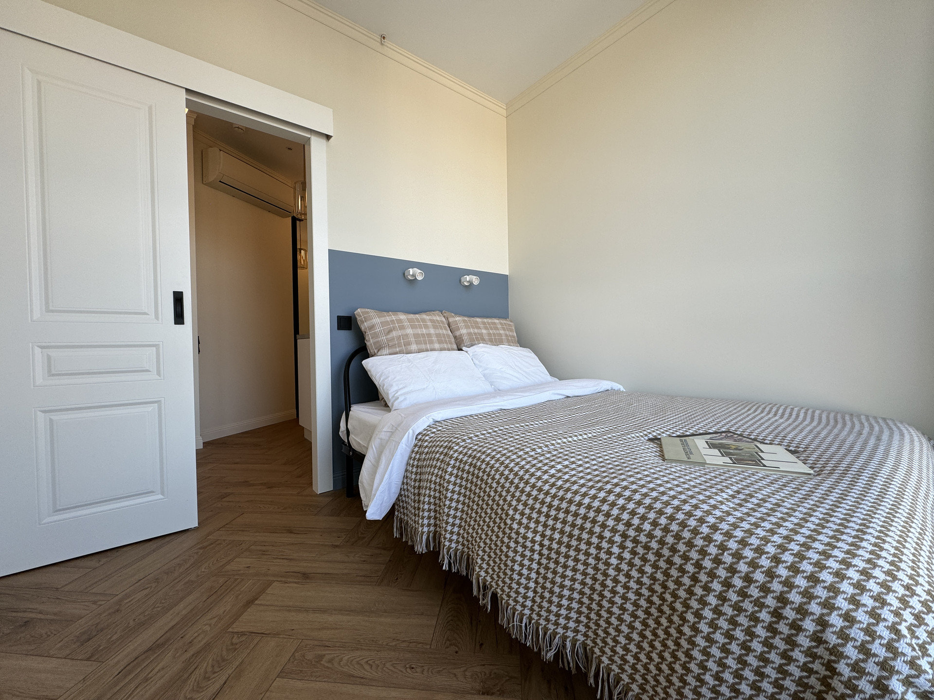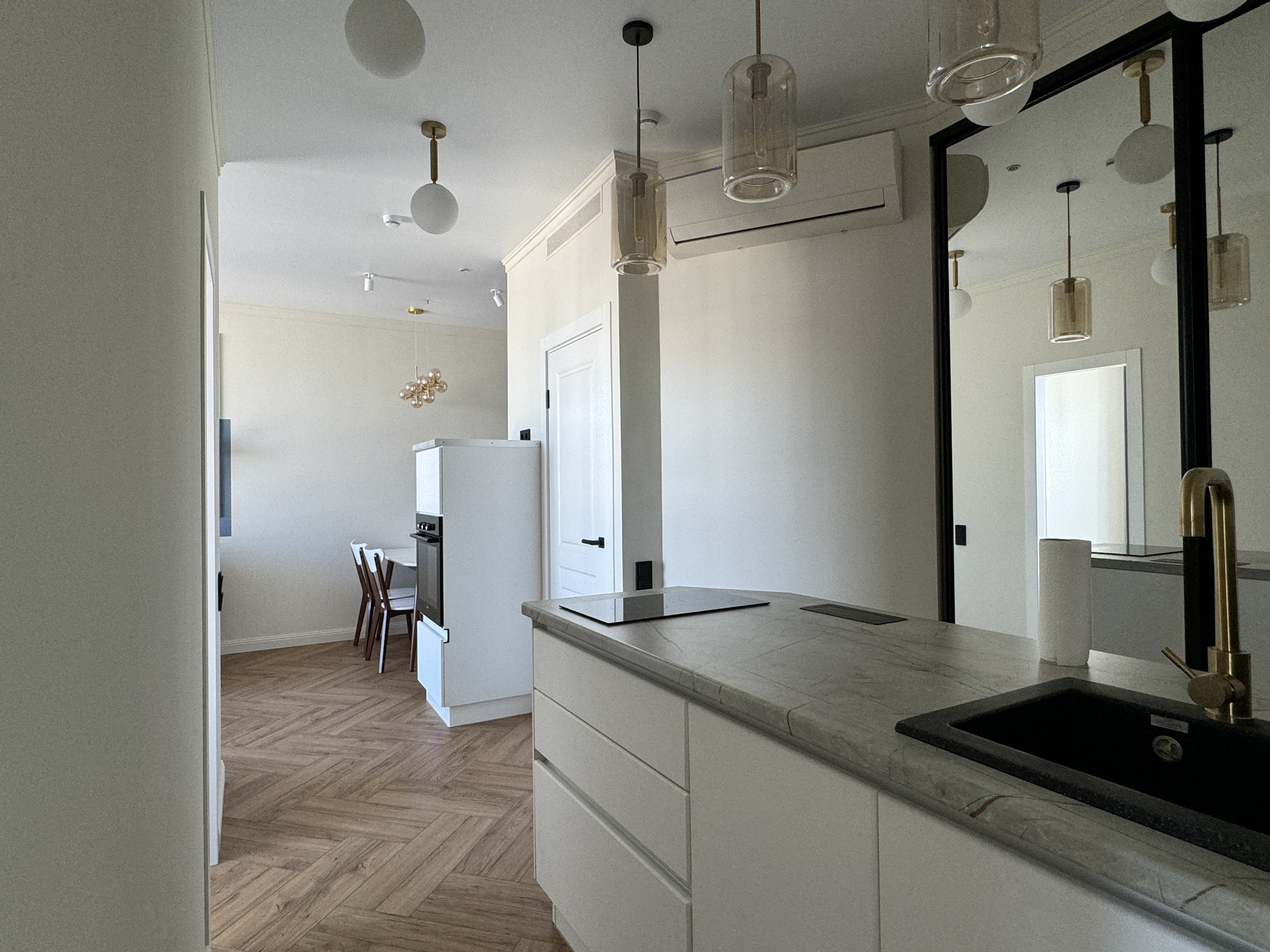 Из мебели: два зеркальных шкафа с системой хранения, кровать с матрасом, обеденный стол и стулья, 2 кресла и пуфик, ТВ тумба, шторы блекаут во всех комнатах. В санузле полноценная ванна 170х70 см и смеситель с терморегулятором, унитаз с инсталляцией.