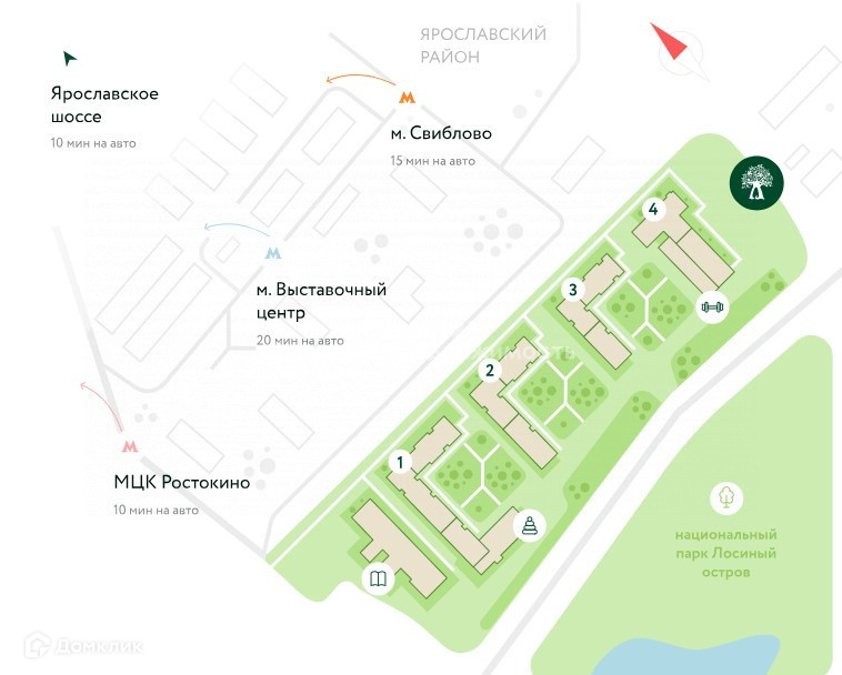 - Встроенный образовательный комплекс, включая садик и школу.
