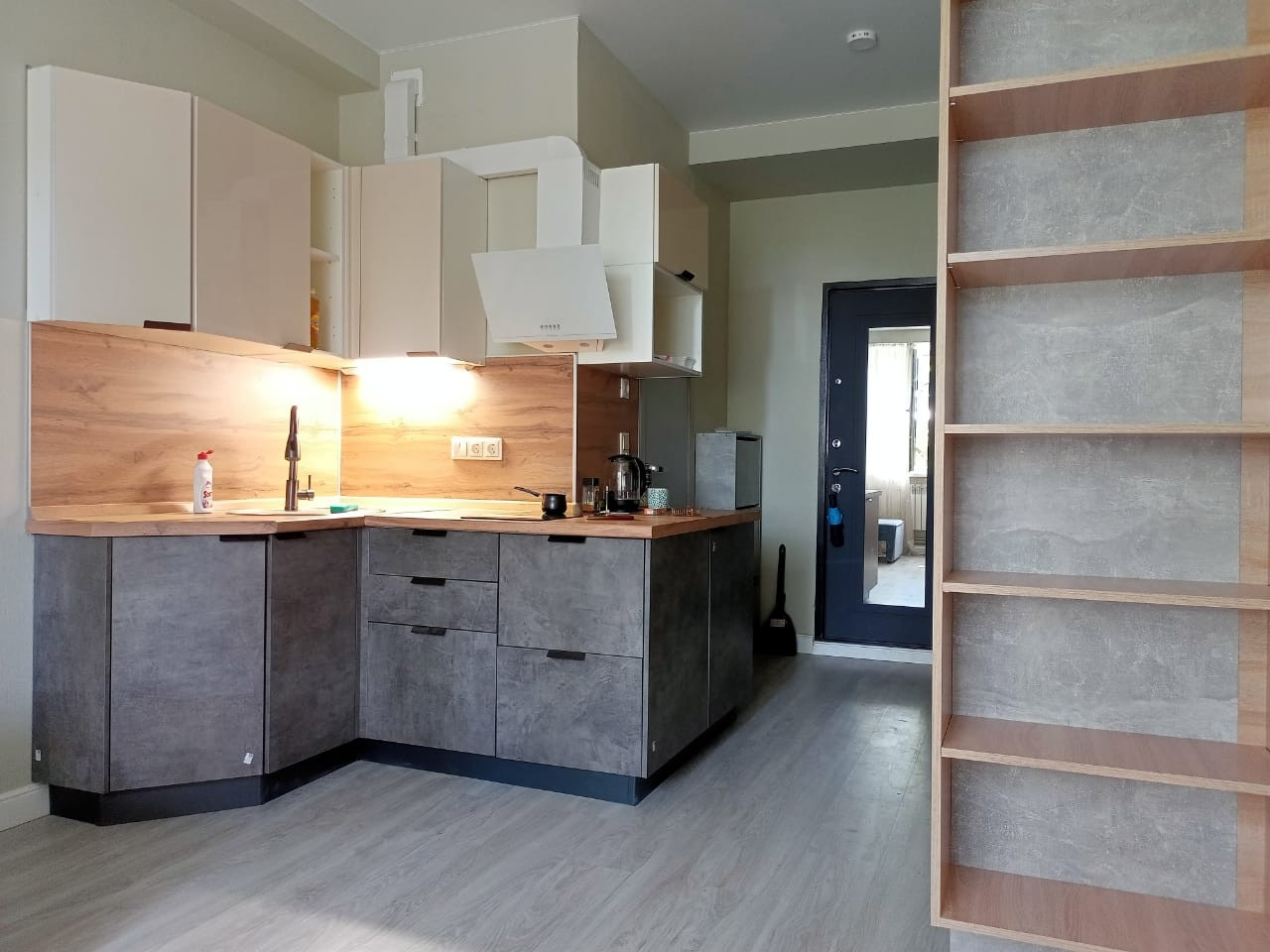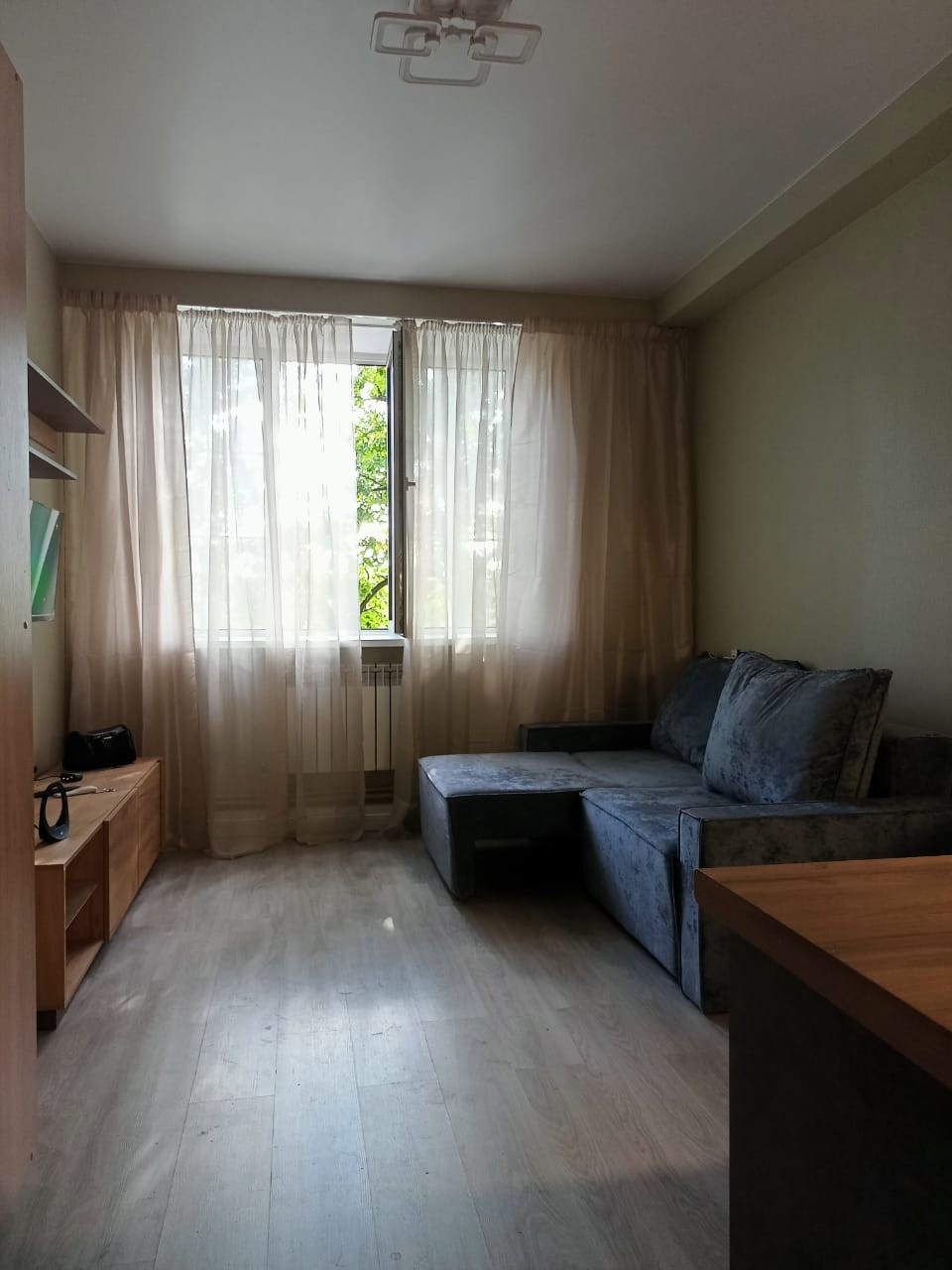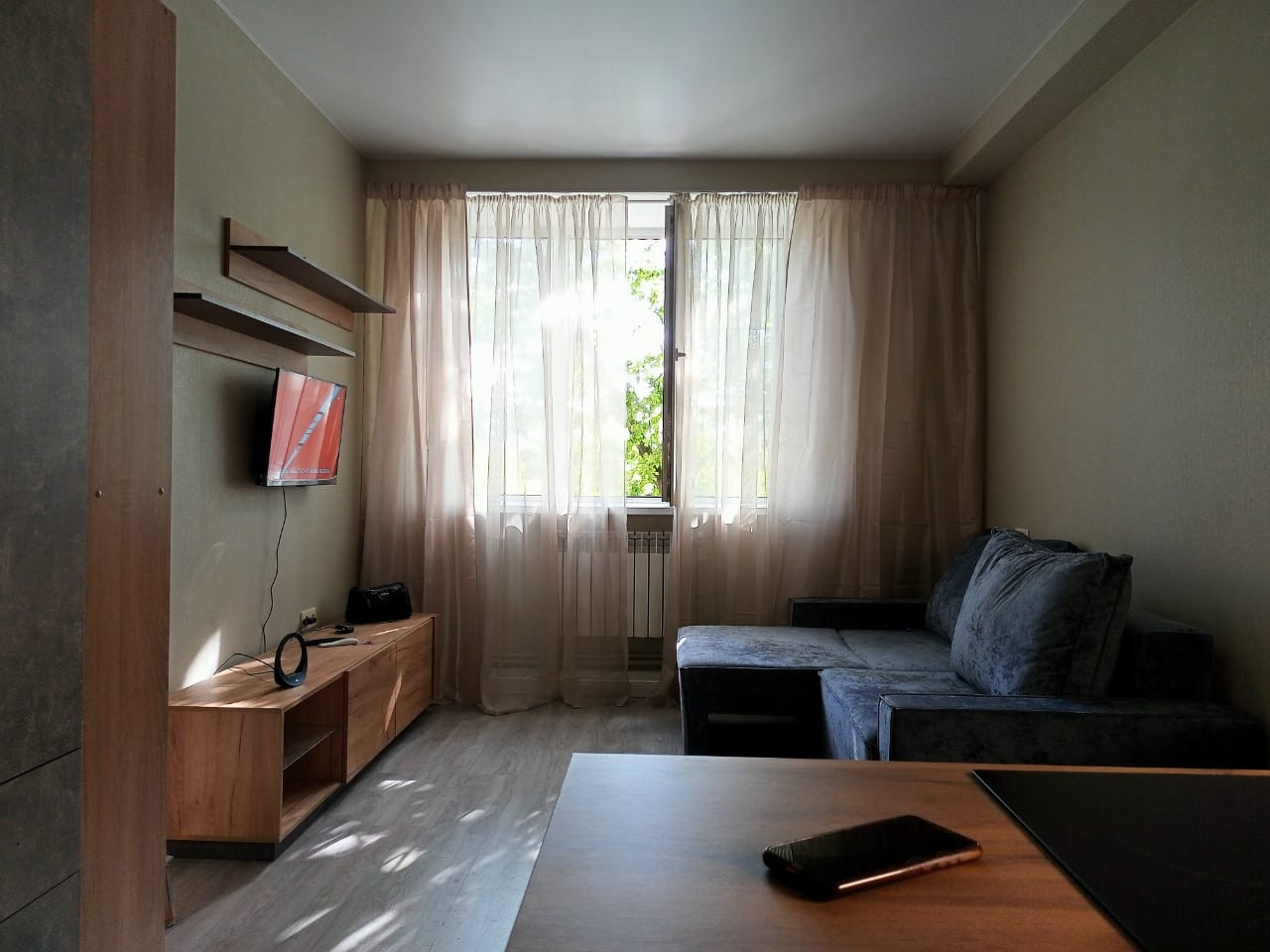 На площади 20 кв метров размещено: функционально продуманная кухня с большим количеством ящиков, диван-трансформер с ящиками для хранения, два полноценных шкафа, открытый стелаж, телевизионная зона. Барный стул для работы или трапезы за подоконником с видом на церковь и лиственницу.