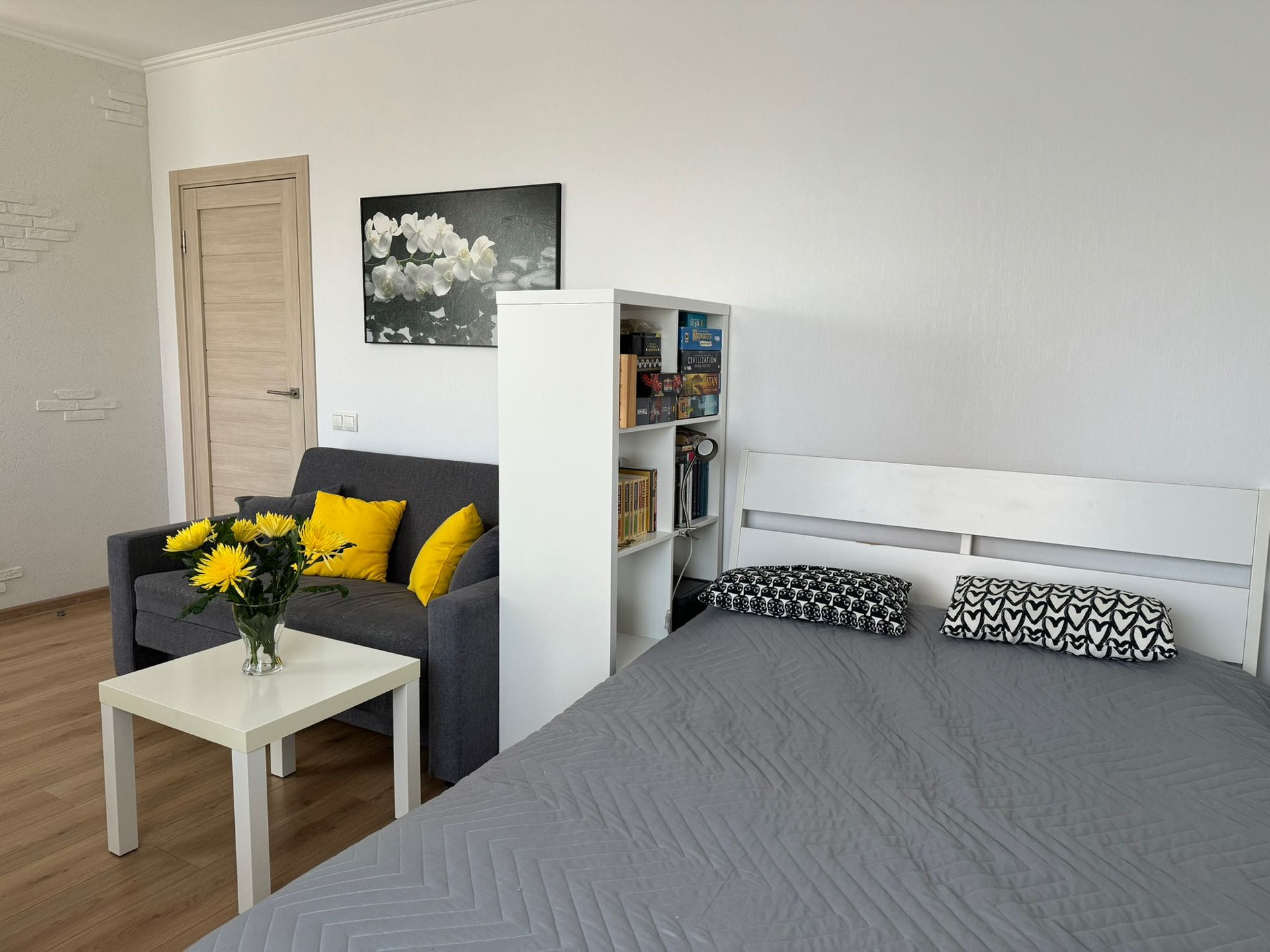 Потолок - бетон штукатурка и покраска, на полу в комнате - хороший ламинат; прихожая, гардеробная и санузел - плитка. Стены - декоративная антивандальная штукатурка и одна  стена в комнате - обои под покраску. Балкон открытый, пол - плитка.