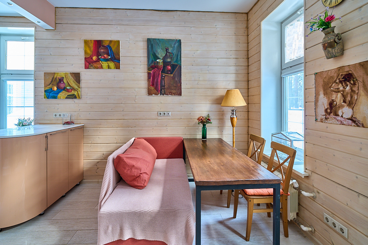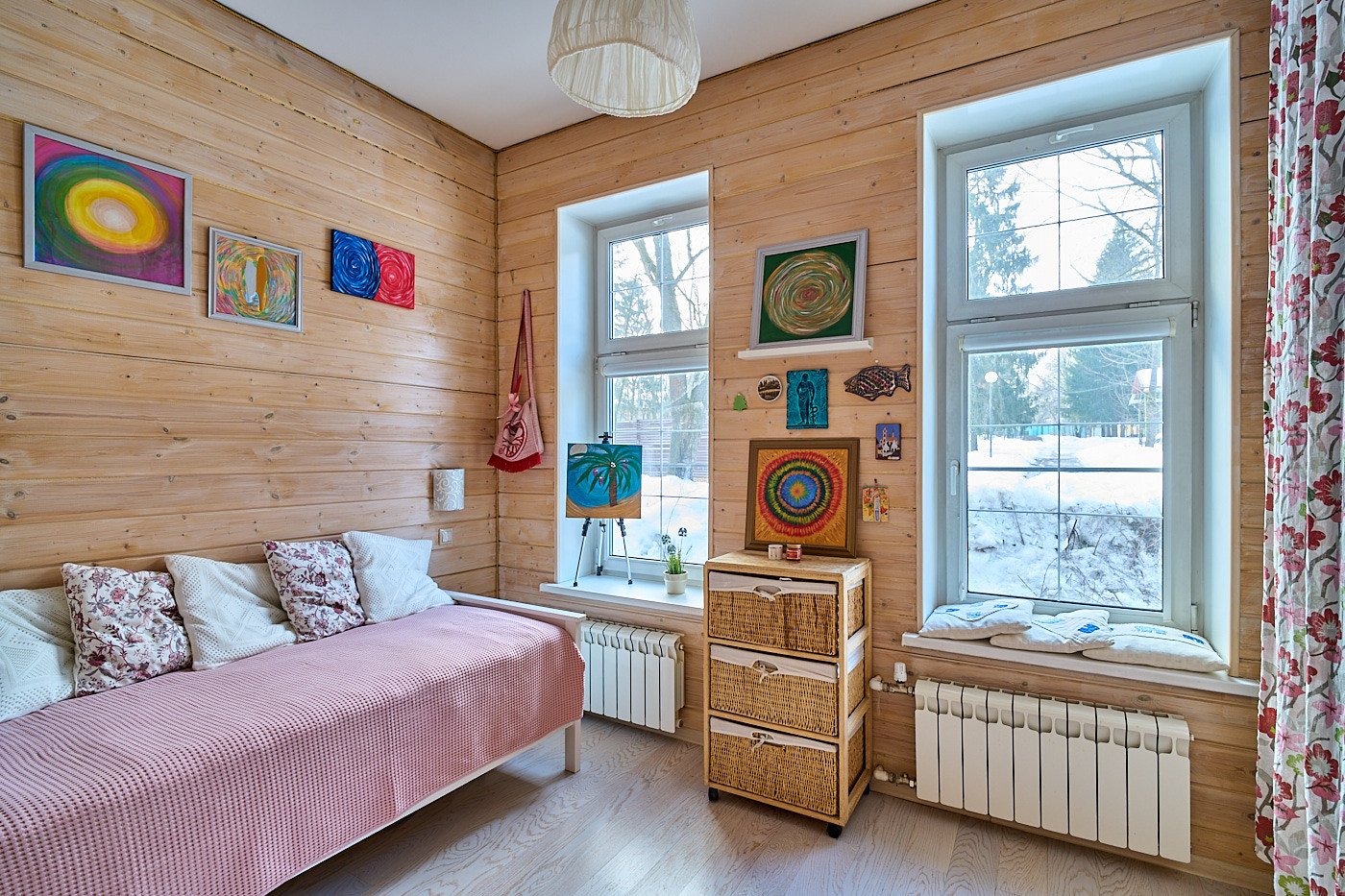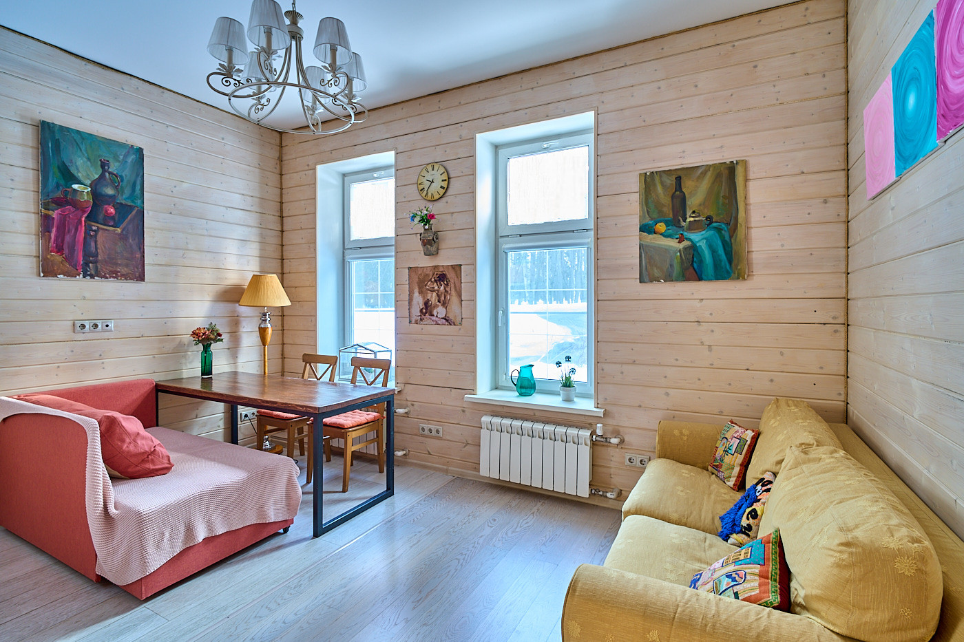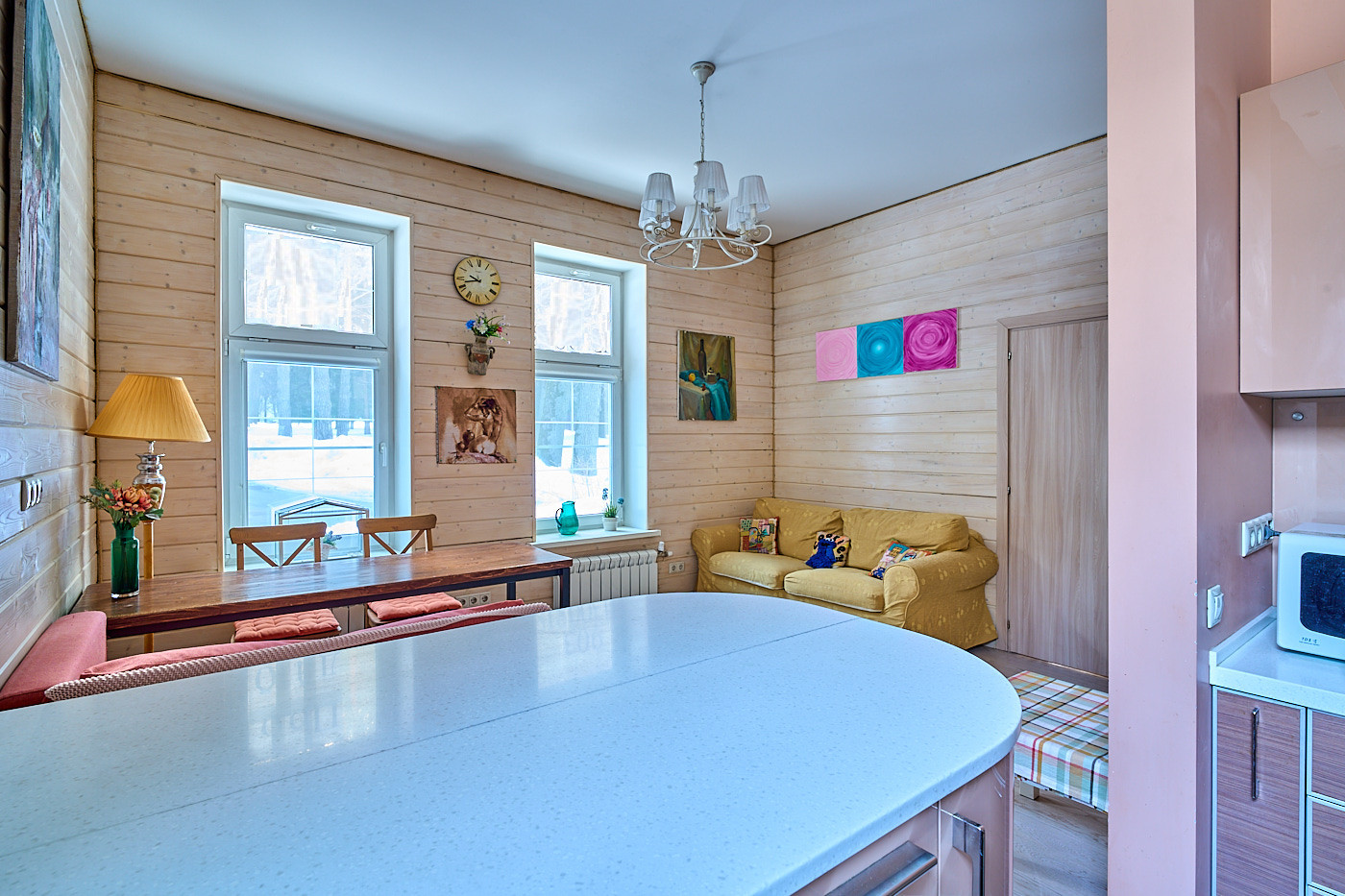 Вся квартира наполнена естественным светом. Из окон открывается неповторимый вид на листву, стройные стволы благородных сосен, летом-на цветы, также можете увидеть прыгающих белок, поющих птиц-это настоящая услада для глаз.
