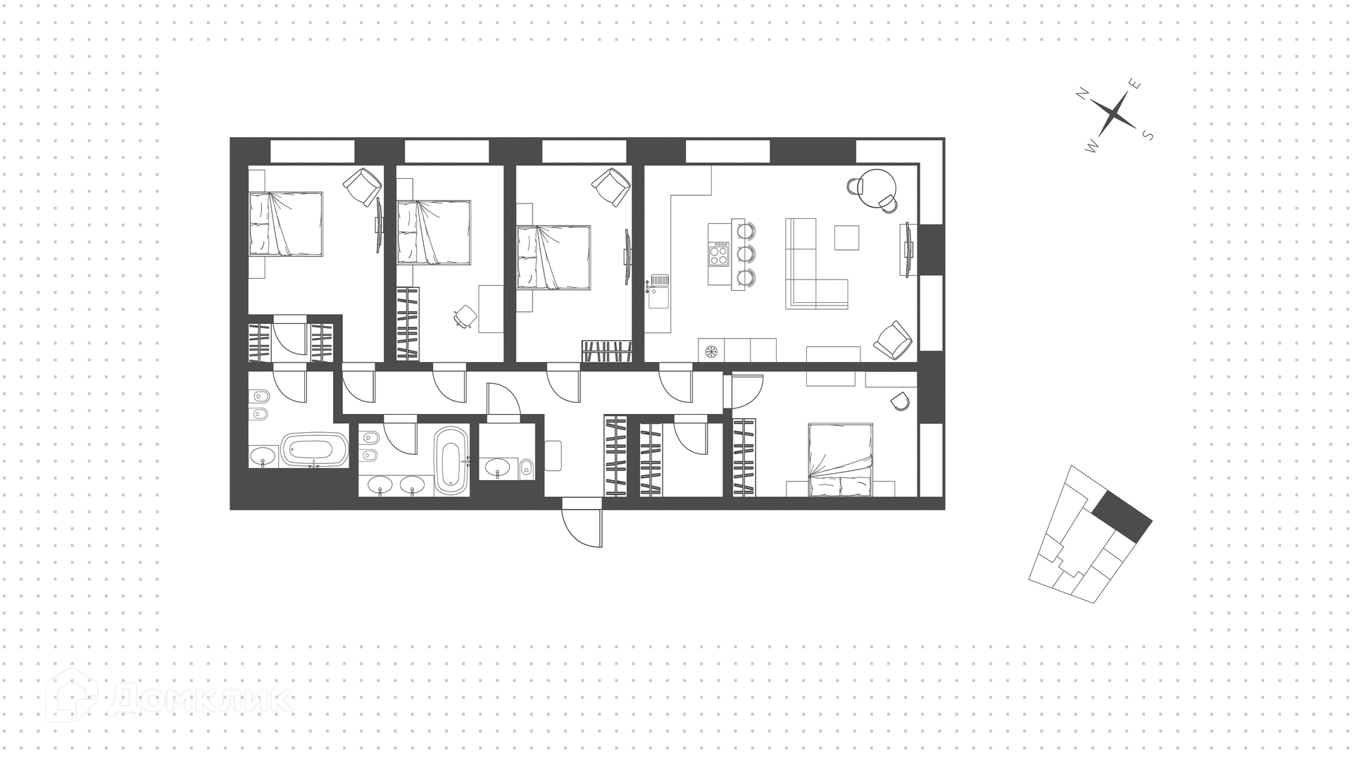 Возможная планировка: кухня-гостиная, три спальни, кабинет или спальня, 2 санузла, 2 гардеробные, постирочная, прихожая. Благодаря панорамным окнам пространство наполнено естественным светом, открываются виды на две стороны света — на город, на Москву-реку и в сторону «Москва-Сити».