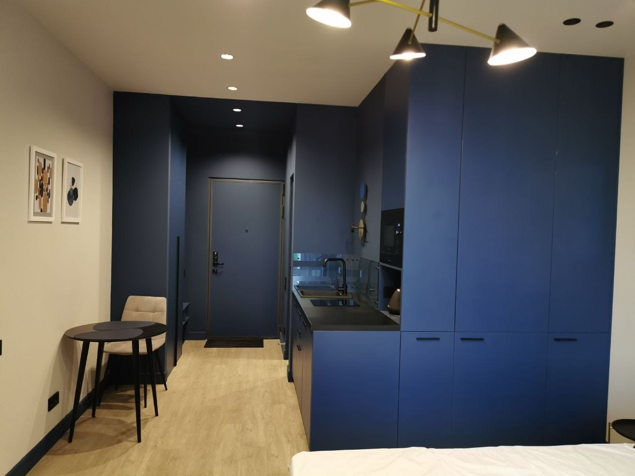 Функциональная планировка квартиры: кухня, спальня с выделенной рабочей зоной,  зоны для хранения, с/у.
