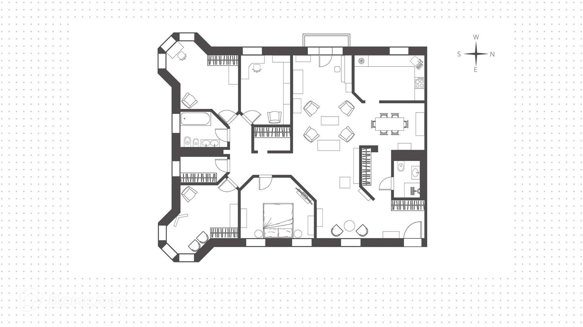 Функциональная планировка: гостиная-столовая, кухня, 3 спальни, кабинет или спальня, 2 санузла, 2 гардеробные, балкон, холл. Окна ориентированы на три стороны света, открываются виды на город и во внутренний двор.