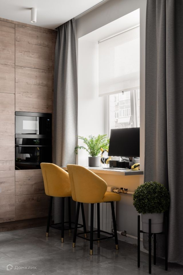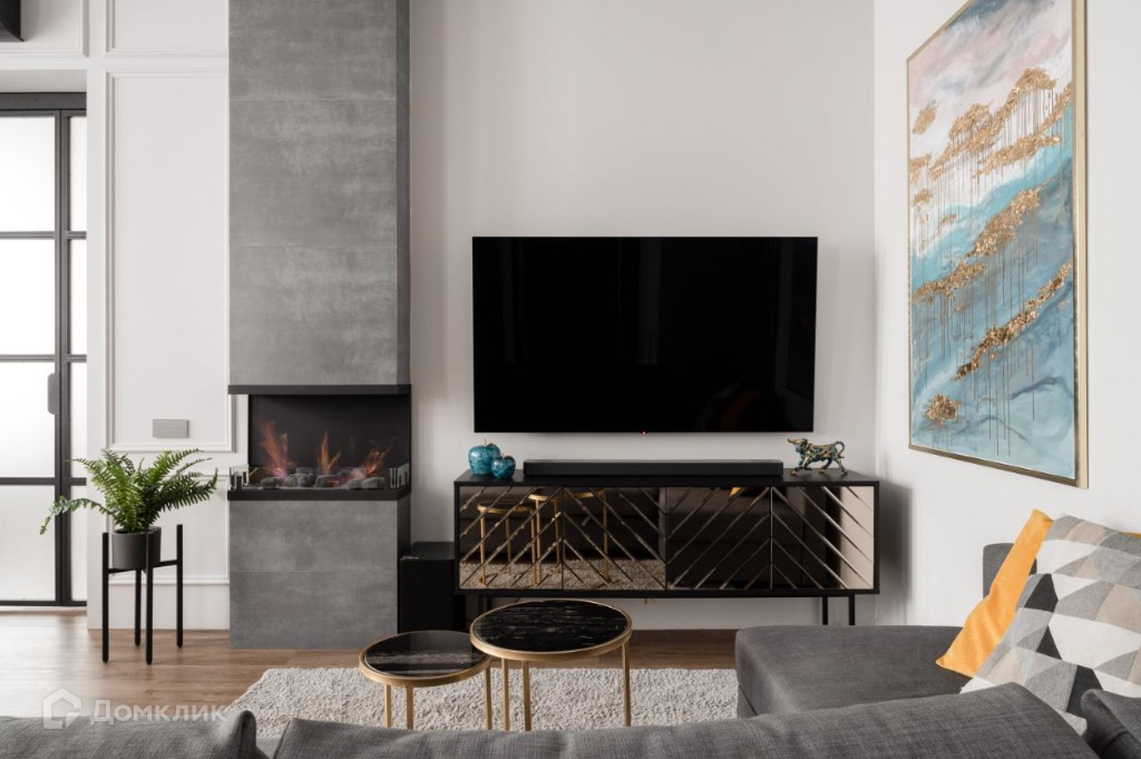 В гостиной камин на био-топливе, угловой диван, полы из кварцвинила. Пол на балконе с подогревом, теплый стеклопакет, окна в пол.