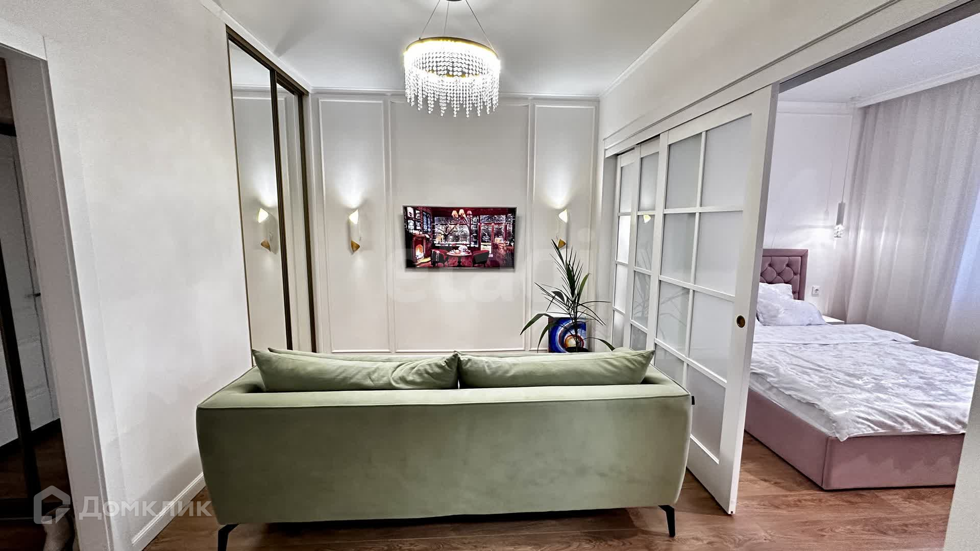 Общая площадь квартиры 42м, очень грамотно разграничено пространство на зону гостиной и спальни за счет выдвижной перегородки.