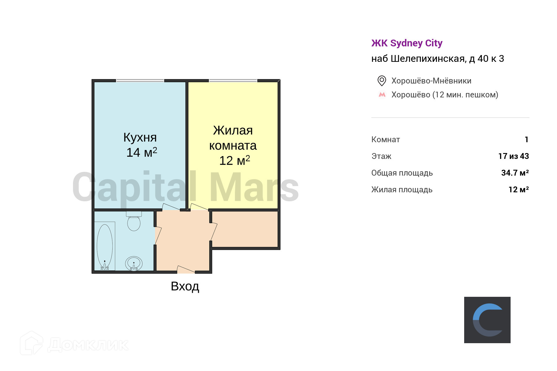 1-комнатная квартира, 34.7 м2, этаж 17 / 43, на продажу в Москве, Шелепихинская набережная, 40к3