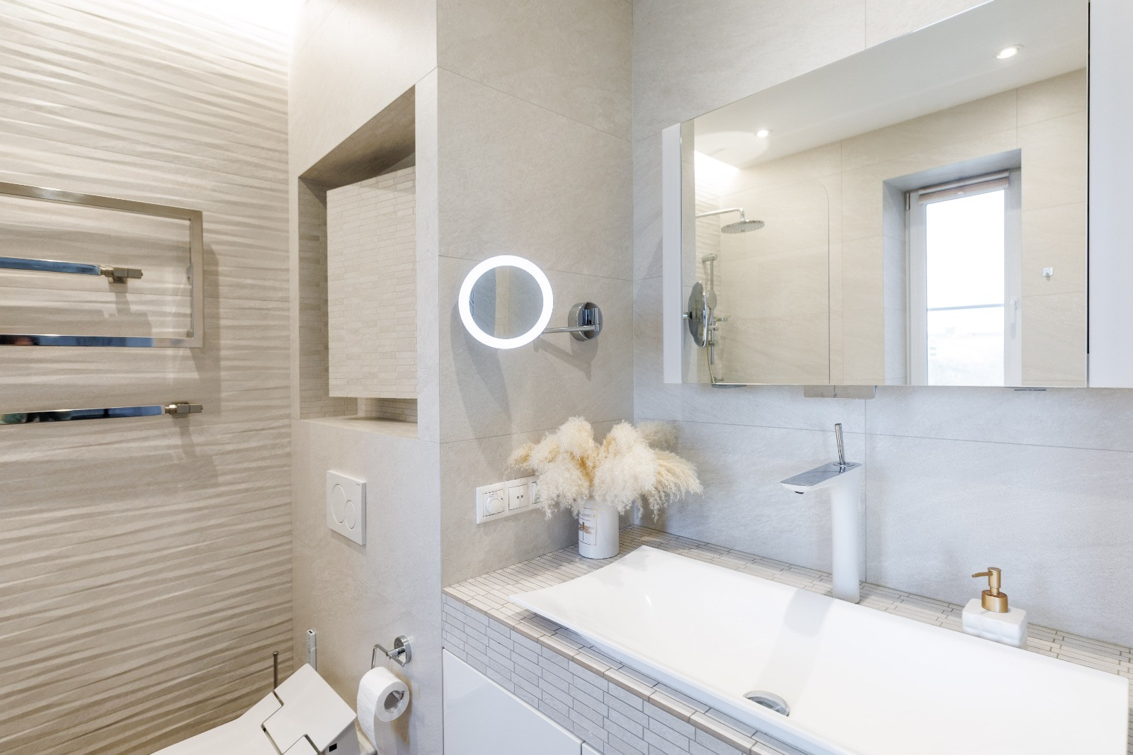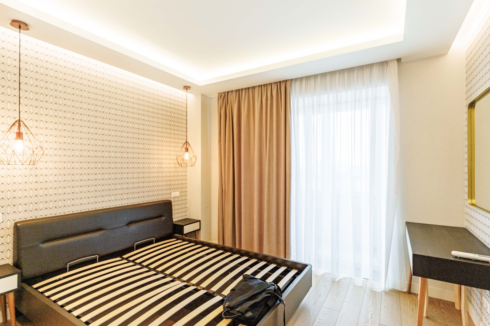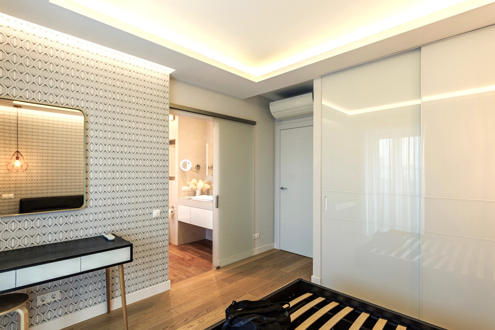 2) Мастер-спальня с собственной большой ванной комнатой с окном, зоной кабинета с панорамным остеклением с видом на БЦ Оружейный, вместительным встроенным шкафом во всю стену.