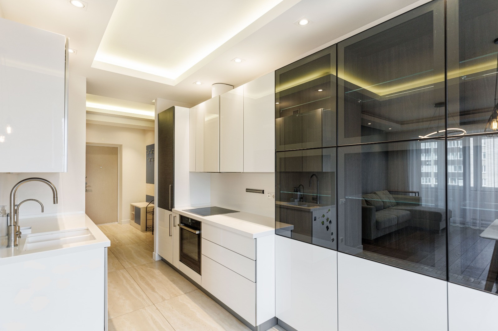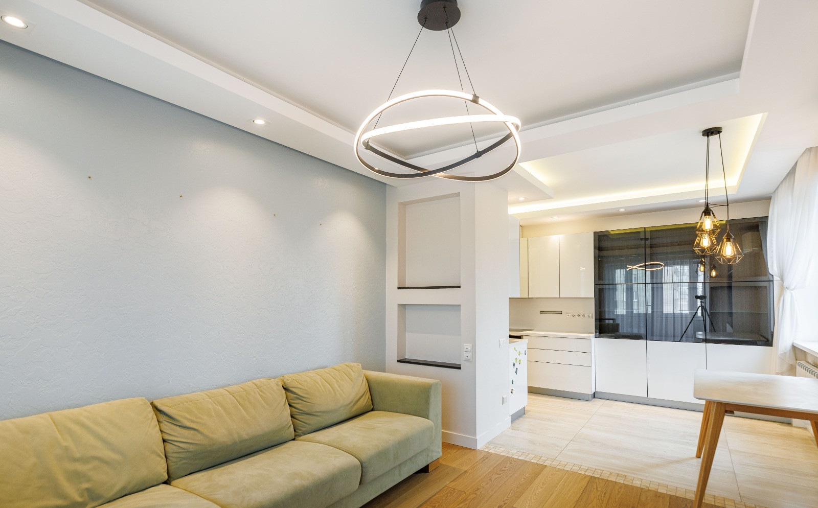 1) Большая кухня-гостиная с обеденной зоной, теплыми полами, камином и уютным приватным пространством. Прекрасное место на утепленном балконе для утренней чашки кофе или вечернего бокала вина с панорамным видом на 11 салютных площадок Москвы.
