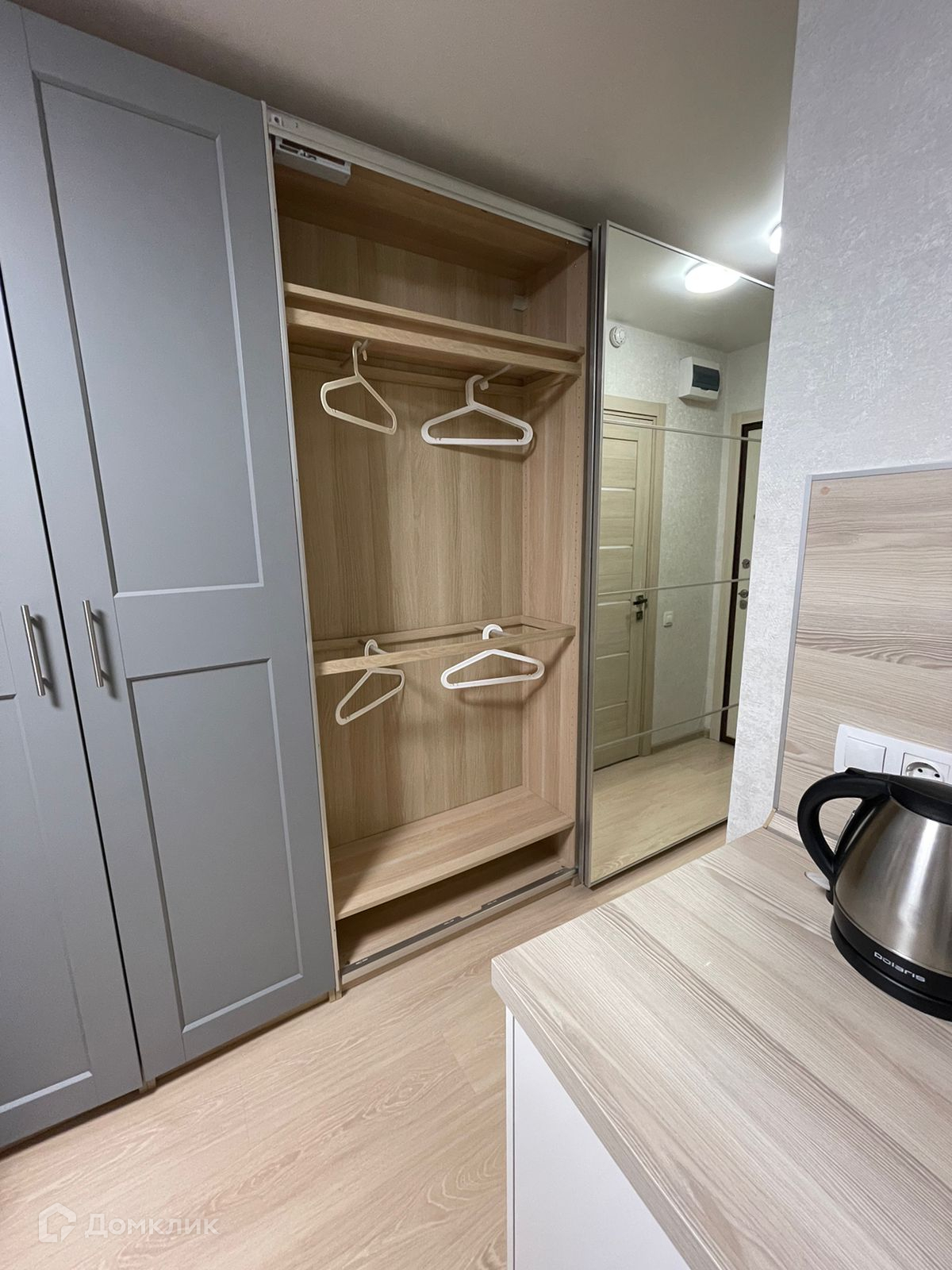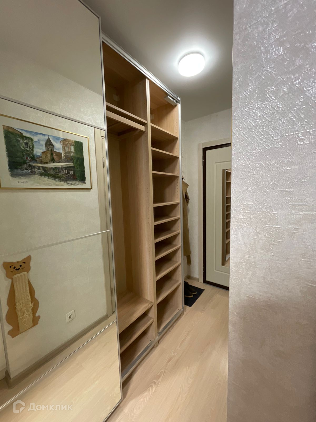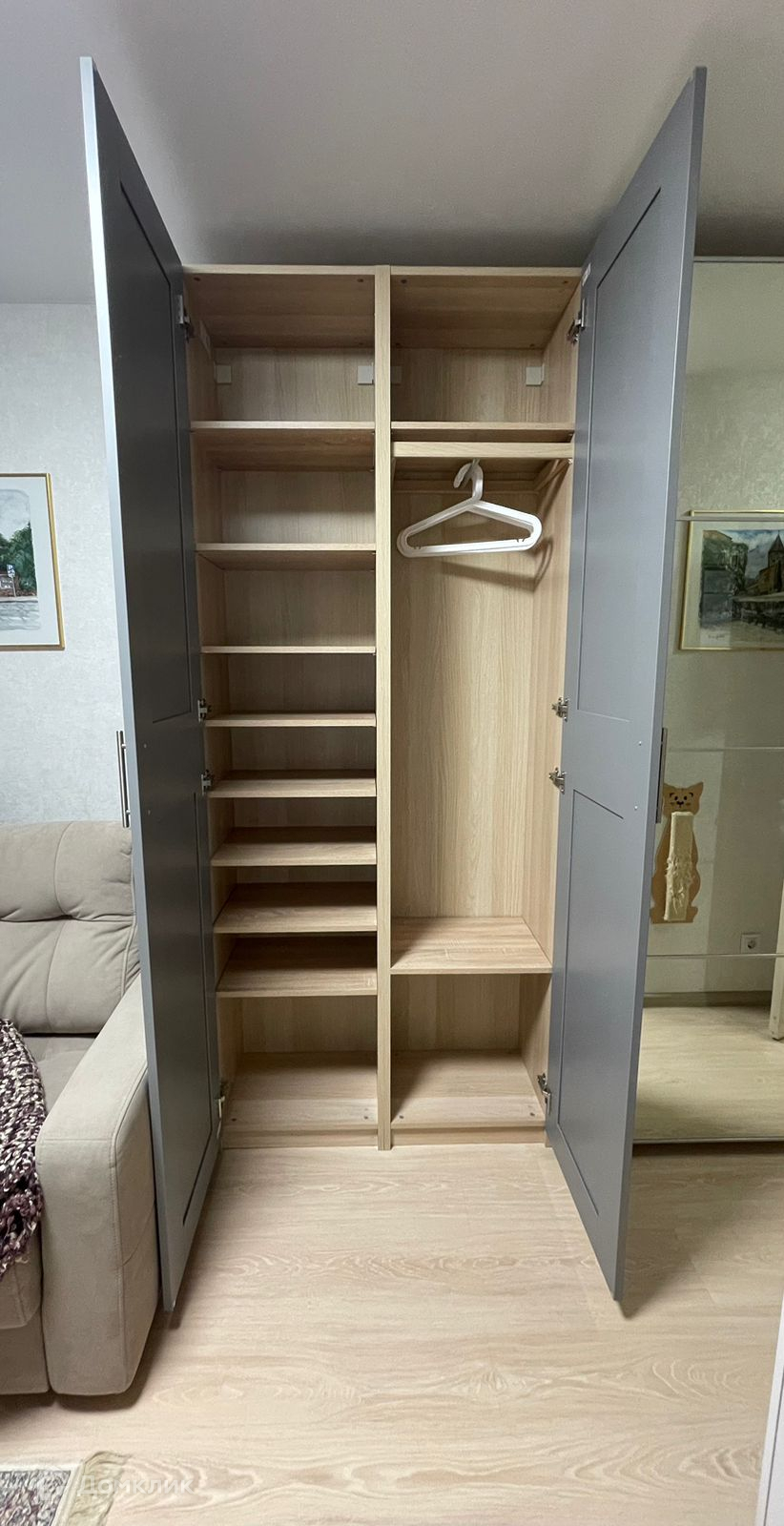 Зона гардеробной-коридора: вместительный шкаф IKEA (одна часть с распашными дверьми, другая часть — шкаф-купе с зеркалами дверьми, глубина 35 см, длина 3 м), открытая вешалка около входной двери.