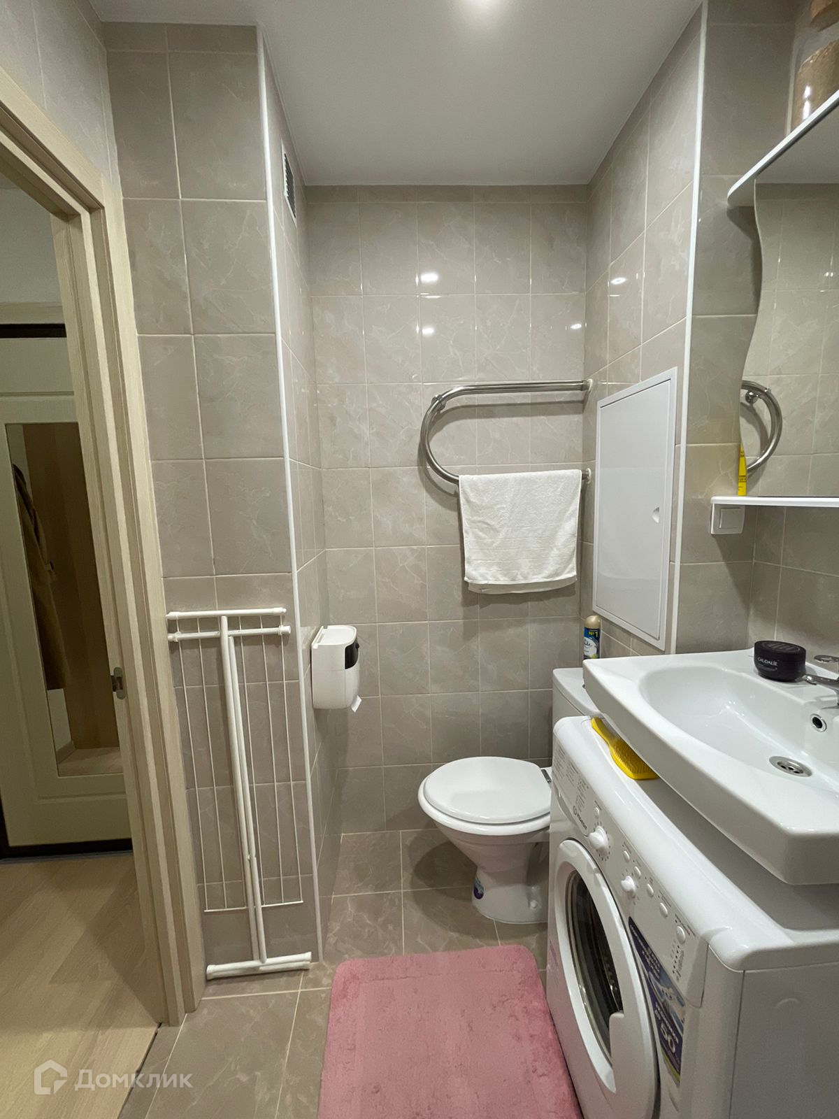 Зона санузла: полотенцесушитель от отопления, стиральная машина INDESIT, зеркальный ящик для хранения над раковиной, ящик для белья.