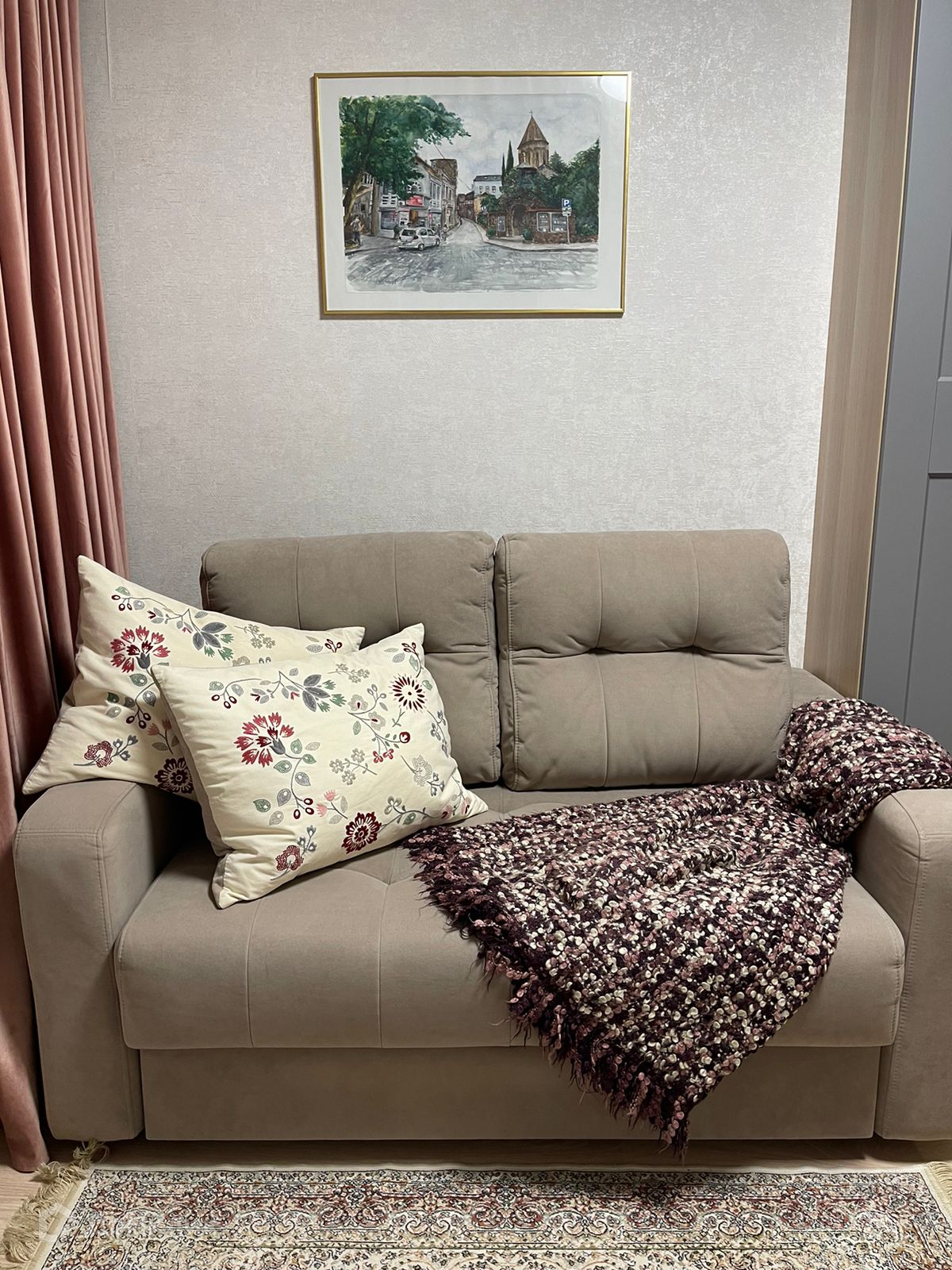 Зона гостиной-спальни: Очень удобный и надежный диван-кровать ПИАФ с легким механизмом открытия/закрытия одним движением, с ящиком для белья (мебельная фабрика «Елена», ширина 120 см).