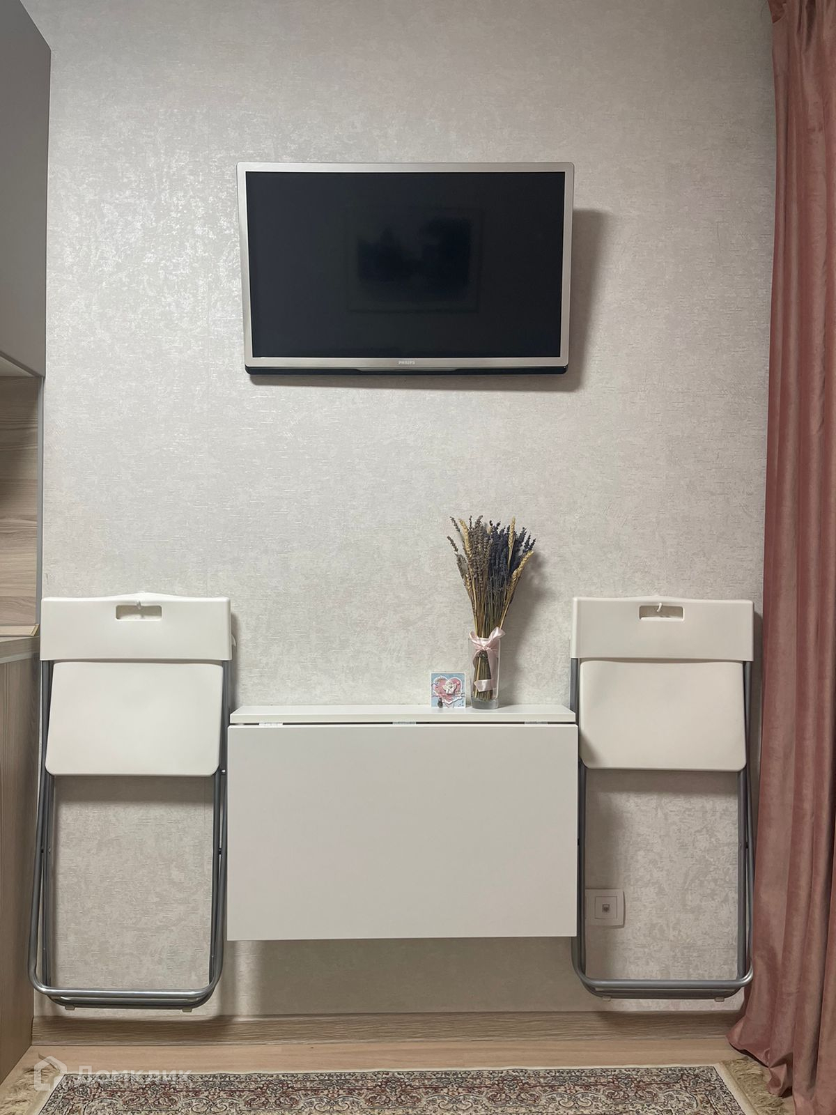Обеденная зона: компактный, но очень вместительный складной стол IKEA, два складных стула IKEA, располагающихся удобно на специальных крючках на стене.
